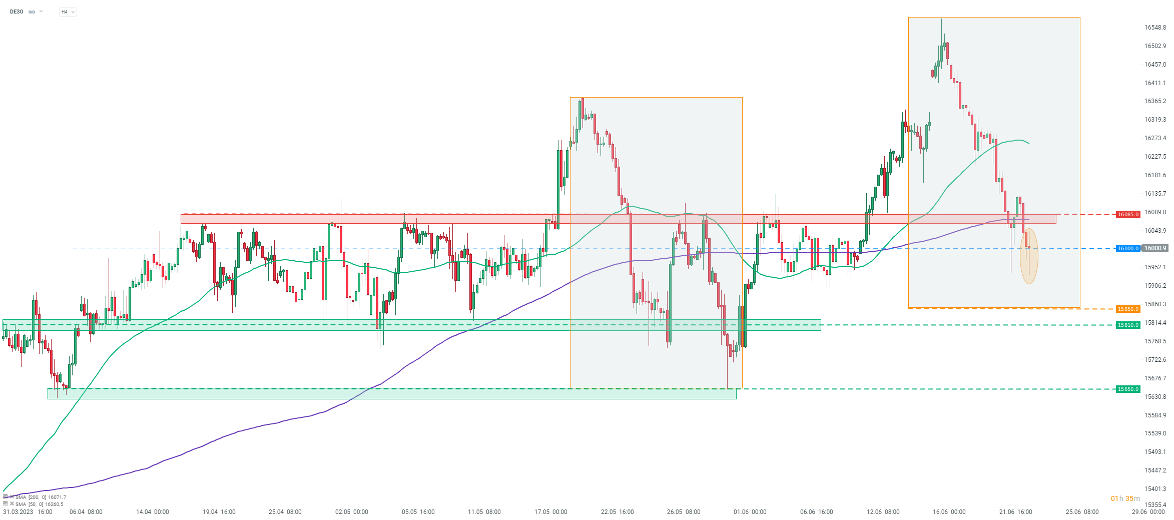 Les chiffres préliminaires des PMI flash pour juin en France et en Allemagne se sont révélés décevants. Les données françaises ont montré un effondrement de l'indice des services, passant de 52,0 à 48,0, ce qui signifie que le secteur était en contraction. Pendant ce temps, les données allemandes ont montré une chute de l'indice manufacturier, passant de 43,2 à 41,0 - le niveau le plus bas depuis mai 2020, lorsque le sentiment dans l'industrie était en baisse en raison de la pandémie de Covid-19 et des mesures de confinement qui en ont résulté. Alors que le DE30 a réagi positivement aux données françaises et a légèrement augmenté, l'indice a été affecté après la publication des données allemandes, car cela laissait entendre que les difficultés de l'économie allemande, notamment dans le secteur manufacturier, se poursuivent.