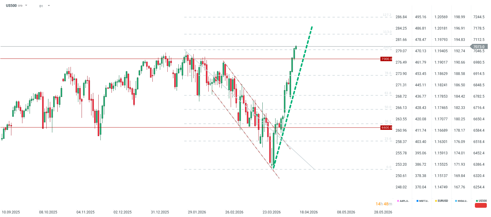 - L'indice US500 atteint des sommets historiques : L'indice a franchi la barre des 7 000 points et teste actuellement le niveau des 7 050 points, porté par l'espoir d'une désescalade du conflit avec l'Iran et la réouverture potentielle du détroit d'Ormuz.