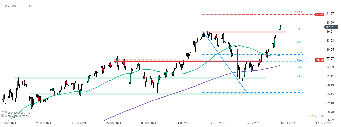 Les prix du pétrole font un nouveau bond aujourd'hui, après avoir dépassé les précédents sommets post-pandémie à la fin de la semaine précédente. Le Brent (OIL) a atteint un nouveau sommet de 7 ans aujourd'hui et a atteint un sommet journalier juste un peu en dessous de 88 dollars le baril. Les investisseurs en pétrole ne tiennent pas compte de l'augmentation du nombre de cas d'Omicron dans le monde et des nouvelles restrictions imposées. Goldman Sachs a publié de nouvelles prévisions pour le Brent, prévoyant un prix moyen de 96 dollars le baril cette année et de 105 dollars le baril en 2023. Goldman estime que le prix du Brent dépassera la barre des 100 dollars au troisième trimestre de cette année. En outre, les perturbations de l'offre en Libye et au Kazakhstan n'ont pas encore été entièrement résolues, ce qui renforce également les perspectives fondamentales de hausse des prix. Enfin, les Houthis ont lancé une attaque de drone contre un aéroport des Émirats arabes unis, ce qui fait craindre que la situation au Moyen-Orient, une région productrice de pétrole clé, ne devienne bientôt plus tendue.