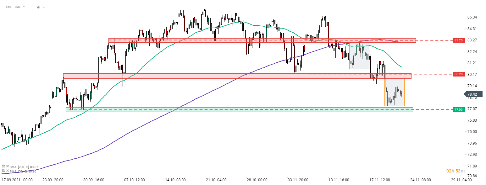Les prix du pétrole continuent de dériver à la baisse, le marché prenant en compte les libérations potentielles de réserves stratégiques de pétrole. Il est dit que les États-Unis, le Japon, la Corée du Sud, l'Inde et la Chine pourraient libérer un total de 120 millions de barils de pétrole afin de réduire les prix du carburant pour les consommateurs. La libération des réserves stratégiques de pétrole pourrait être annoncée lors du discours de J. Biden aujourd'hui (20h00). Pendant ce temps, les membres de l'OPEP+ comme la Russie ou l'Arabie saoudite s'en tiennent à leur discours et affirment qu'une baisse de la demande au tournant des années 2021 et 2022 est très probable, surtout après que les pays européens ont commencé à réimposer des restrictions en cas de pandémie. En conséquence, l'OPEP a prévenu qu'elle pourrait reconsidérer la poursuite de l'augmentation de la production lors de sa prochaine réunion. La libération des réserves stratégiques n'aura qu'un impact à court terme sur le marché. Il ne faut pas oublier que les réserves stratégiques devront être réapprovisionnées, de sorte que leur libération maintenant signifiera que les pays devront bientôt acheter plus de pétrole. En revanche, si l'OPEP+ décide de ne pas augmenter sa production, cela pourrait avoir un effet plus durable sur les prix.