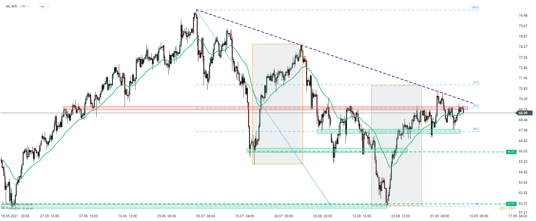 La semaine dernière, la correction haussière sur l'OIL.WTI a été stoppée au niveau de la ligne de tendance descendante. Le prix s'est replié par la suite, mais les acheteurs ont réussi à trouver un support dans la zone située autour du retracement à 38,2 % de l'impulsion à la baisse amorcée au début du mois de juillet (zone de 67,60 $). Le mouvement haussier qui a suivi a poussé le prix vers le retracement à 50 % à environ 69,60 $. Un repli depuis cette zone peut être observé à l'heure actuelle et, en l'absence de catalyseurs majeurs à court terme, l'OIL.WTI pourrait s'échanger dans une fourchette marquée par les retracements à 38,2 % et à 50 %. Le pétrole parvient plus ou moins à se maintenir dans un contexte de sell-off massif sur les marchés actions, avec des amplitudes de mouvement beaucoup plus réduites. Le rapport de l'API d'hier a révélé une baisse moins importante que prévu des stocks de pétrole et les investisseurs attendront une confirmation dans le rapport du DOE d'aujourd'hui (17h00). Cependant, les rapports du DOE n'ont pas réussi à déclencher de grands mouvements de prix récemment et la situation pourrait se répéter aujourd'hui. Si c'est le cas, les investisseurs doivent attendre une cassure au-dessus du retracement à 50 % ou en dessous du retracement à 38,2 % afin de déterminer la direction du prochain mouvement important. Une cassure au-dessus du retracement à 50 % et de la ligne de tendance à la baisse qui se trouve légèrement au-dessus peut laisser présager un retournement de tendance.