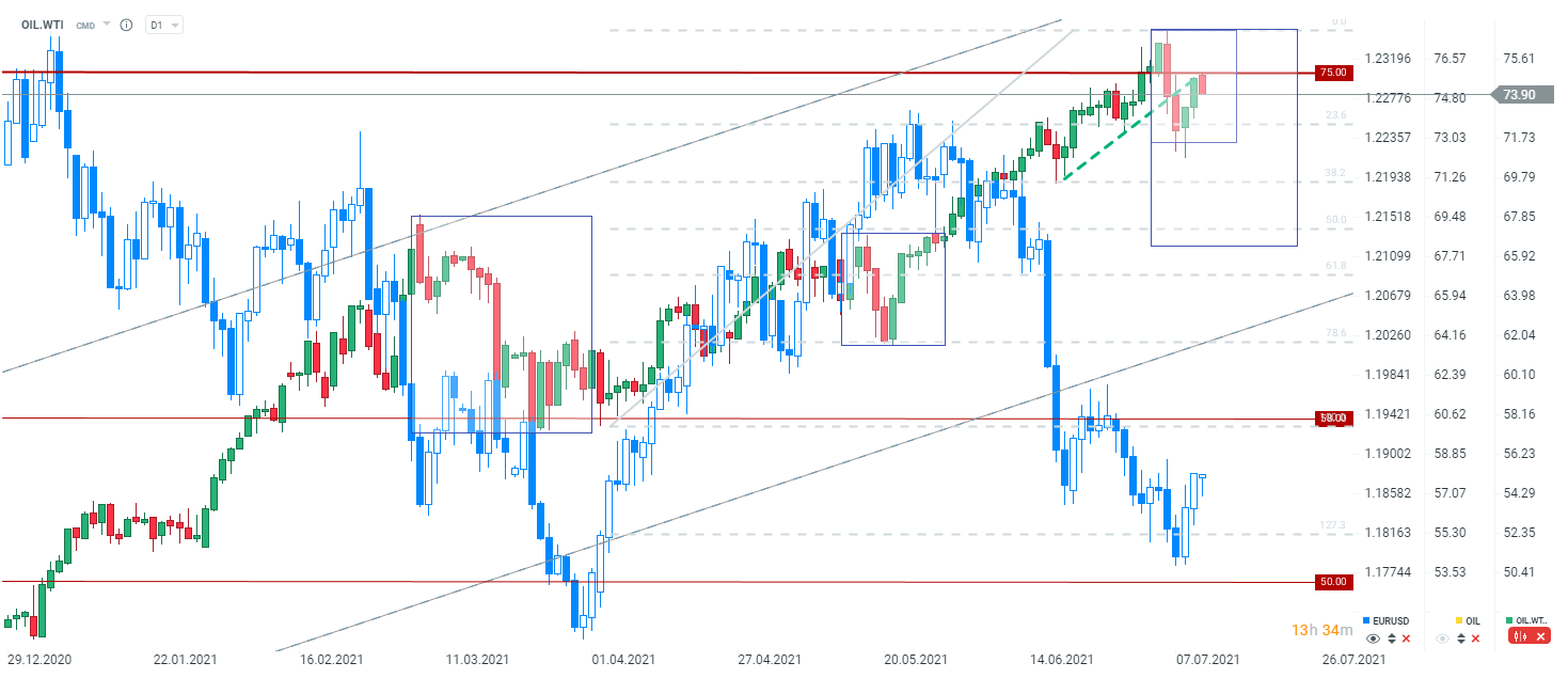 Le pétrole est en baisse aujourd'hui malgré un rebond sur le marché EURUSD. L'augmentation de l'offre des membres de l'OPEP ainsi que l'incertitude liée à la pandémie sont les principaux facteurs qui poussent les prix du pétrole actuellement. Source : xStation5