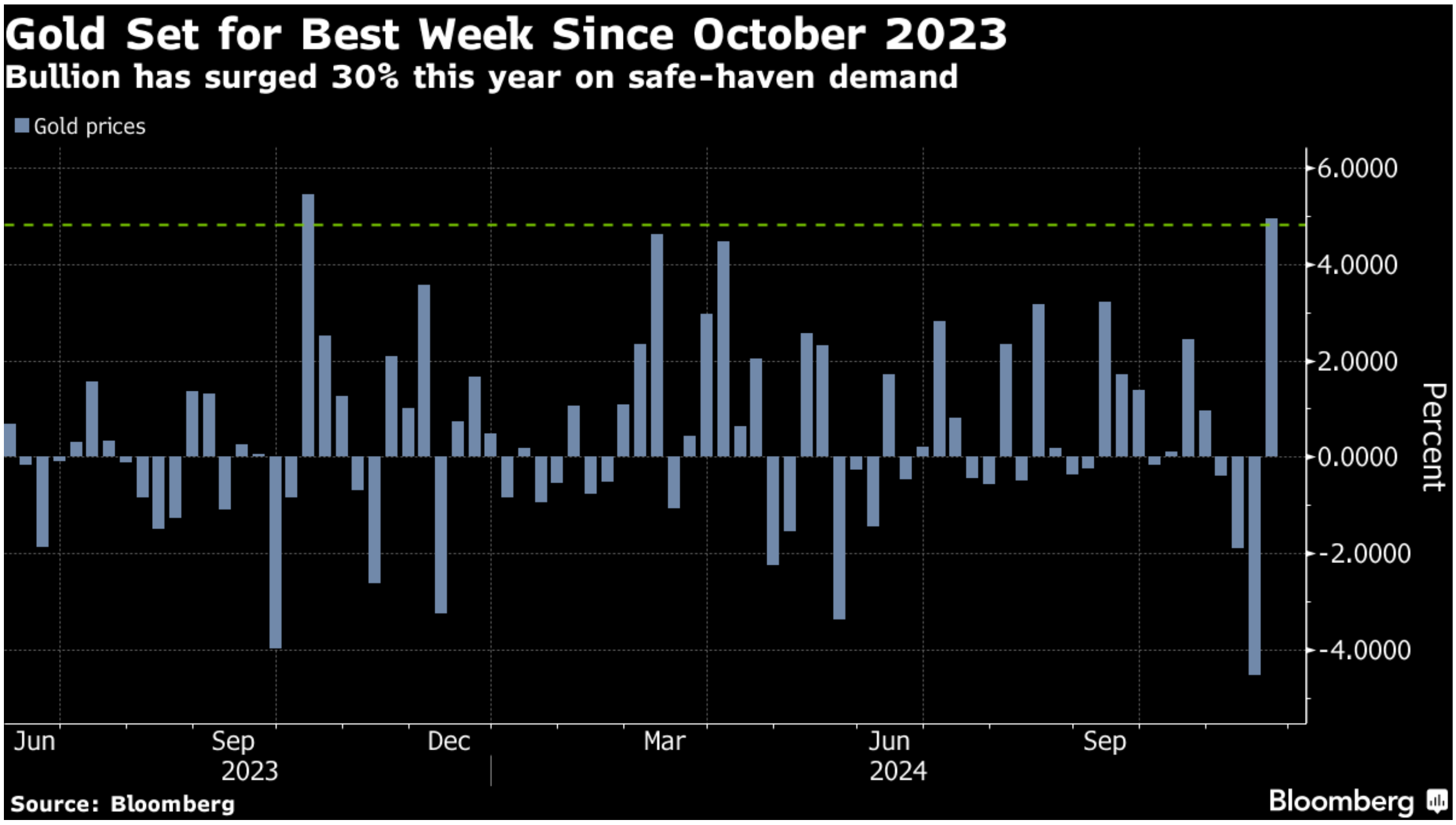 Le prix de l'or a bondi à 2 694 dollars aujourd'hui, marquant son gain hebdomadaire le plus important depuis octobre 2023, avec une augmentation remarquable de 4,9 % due à l'aggravation des tensions géopolitiques et à l'évolution des attentes en matière de politique monétaire. La hausse du métal précieux a été particulièrement remarquable, affichant des gains pendant cinq sessions consécutives dans un contexte d'escalade des conflits entre la Russie et l'Ukraine.