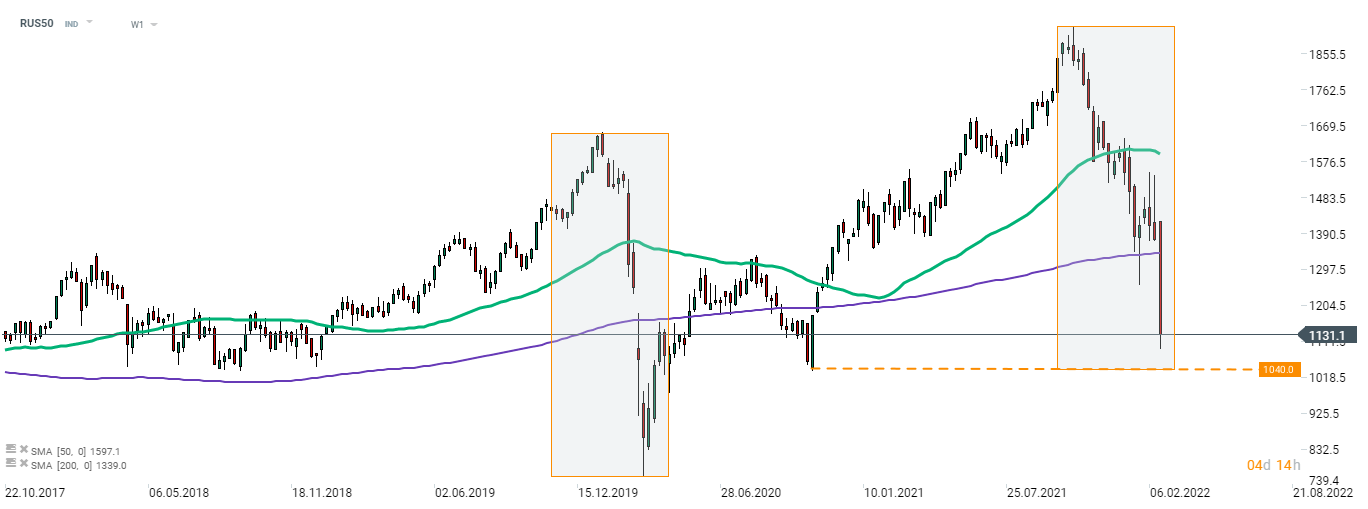 En regardant le graphique du RTS russe (RUS50) en intervalle hebdomadaire, nous pouvons voir que l'indice se rapproche d'un niveau de support clé à 1 040 pts, suite à une cassure sous la moyenne mobile 200 semaines (ligne violette). Cette zone est marquée non seulement par un bas de début novembre 2020 mais aussi par la limite inférieure de la structure Overbalance. Cette structure marque l'amplitude de la baisse de la pandémie de 2020 et une cassure sous la structure serait un signal baissier fort.