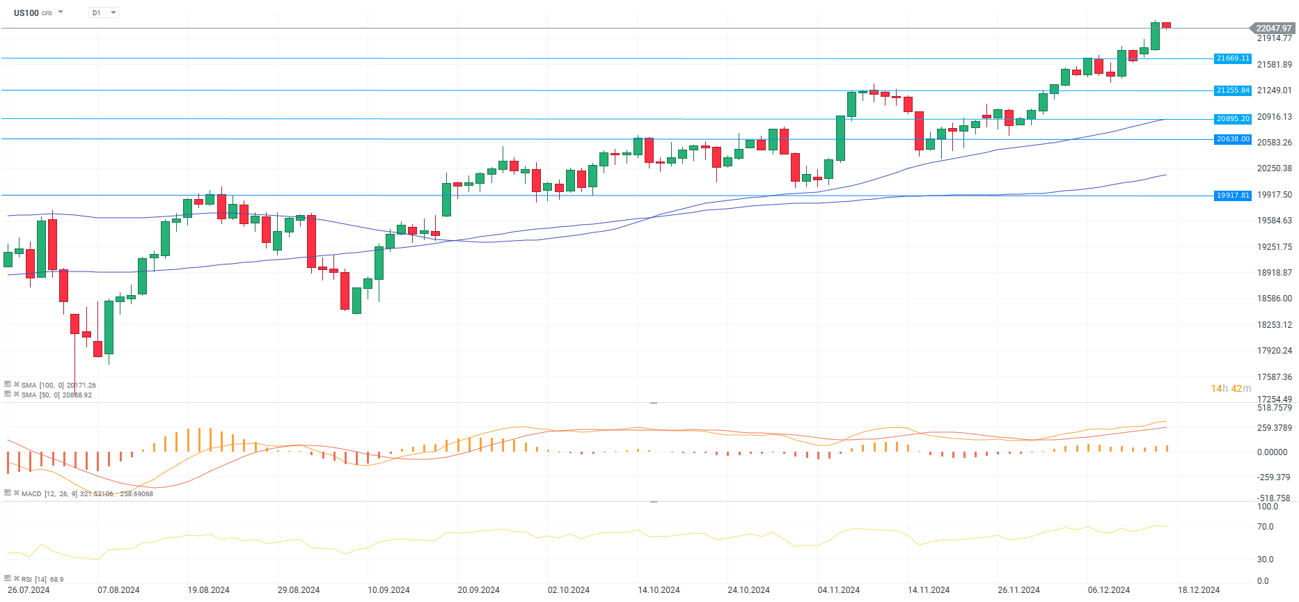 L'indice Nasdaq-100, représenté par le contrat US100, a atteint une clôture record hier. Le sommet de la mi-décembre à 21 669 et le sommet de la mi-novembre à 21 255 constituent les premiers niveaux de soutien pour les haussiers, tandis que le sommet de la mi-juillet à 20 895, étroitement aligné sur la moyenne mobile de 50 jours à 20 851, offre un soutien supplémentaire. Les baissiers pourraient viser 20 896 comme niveau clé pour exploiter la divergence baissière, avec des cibles ultérieures comprenant la SMA de 100 jours et les sommets d'août près de 19 917, qui représentent des niveaux de baisse critiques.