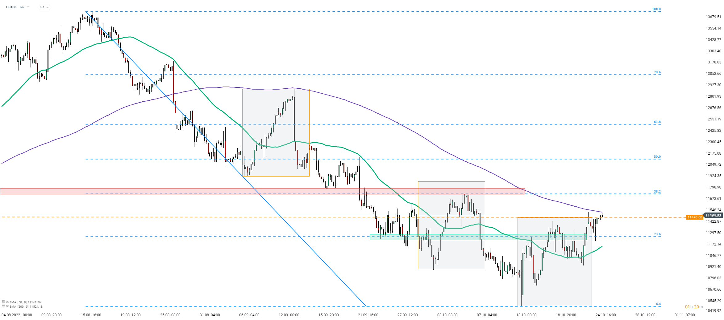 En regardant le graphique Nasdaq-100 (US100) à l'intervalle H4, nous pouvons voir que l'indice fait une cassure au-dessus de la limite supérieure d'une géométrie de marché local. Cependant, une autre résistance importante peut être trouvée légèrement au-dessus de cet obstacle - la moyenne mobile sur 200 périodes (ligne violette). En conséquence, toute la zone entourant la zone de 11 500 pts peut être considérée comme une résistance importante. Si nous constatons une cassure au-dessus, le prochain objectif des haussiers pourrait être le retracement de 38,2% de l'impulsion à la baisse lancée à la mi-août dans la zone des 11 725 pts.