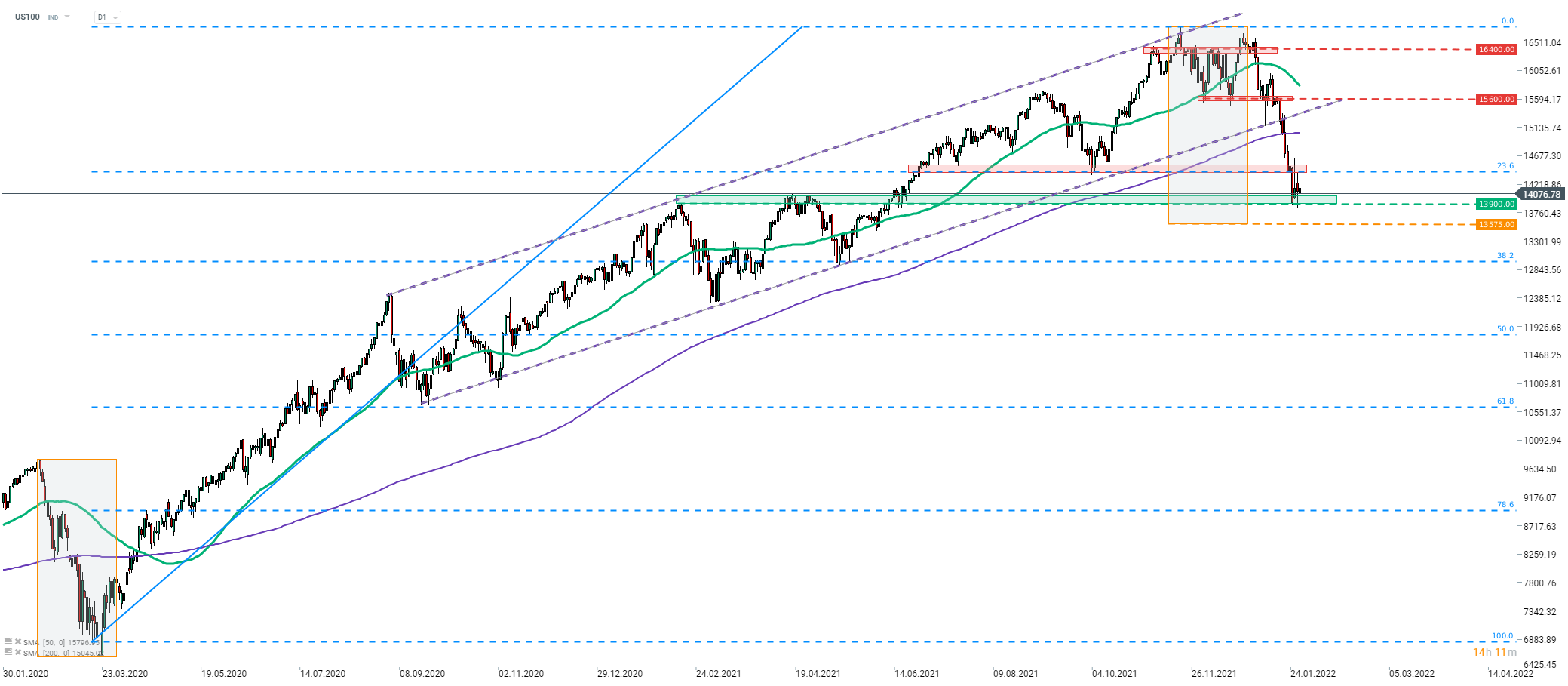 La publication d'un solide rapport sur les bénéfices du quatrième trimestre 2021 par Apple hier, après la clôture de la séance de Wall Street, n'a pas réussi à faire progresser les valeurs du secteur technologique. Alors que les indices ont quelque peu rebondi au cours des échanges asiatiques, une autre vague de vente est arrivée au lancement de la session européenne au comptant aujourd'hui. Le Nasdaq-100 (US100) se négocie à nouveau dans la zone des 14 000 pts. Les perspectives d'un resserrement plus rapide et plus significatif de la Fed mettent les marchés boursiers sous pression, les actions technologiques et les petites capitalisations étant plus durement touchées que les autres.