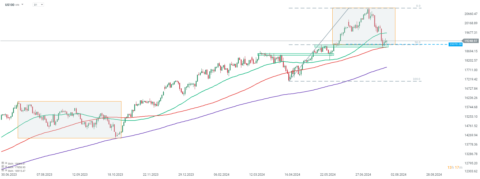 Les résultats financiers des grandes entreprises technologiques seront le principal moteur du Nasdaq-100 (US100) cette semaine. En examinant le graphique de l’US100 en intervalle journalier, on constate que l'indice a stoppé sa correction récente et évolue à la hausse depuis le début de la semaine. Il est à noter que le recul a été stoppé dans une zone de support importante. La zone située entre 18 900 points et 19 070 points est marquée par les précédentes réactions de prix, la moyenne mobile sur 100 sessions, le retracement de 50 % d'un mouvement haussier initié à la mi-avril, ainsi que la limite inférieure de la géométrie du marché. Le rebond à partir de cette zone suggère que la tendance haussière est toujours en vigueur et que l'indice pourrait revenir à ses récents sommets historiques. Cependant, beaucoup dépendra des résultats des grandes entreprises technologiques qui seront publiés cette semaine. Par ailleurs, les investisseurs doivent garder à l'esprit que la décision de taux de demain par le FOMC pourrait également avoir un impact sur les indices de Wall Street.