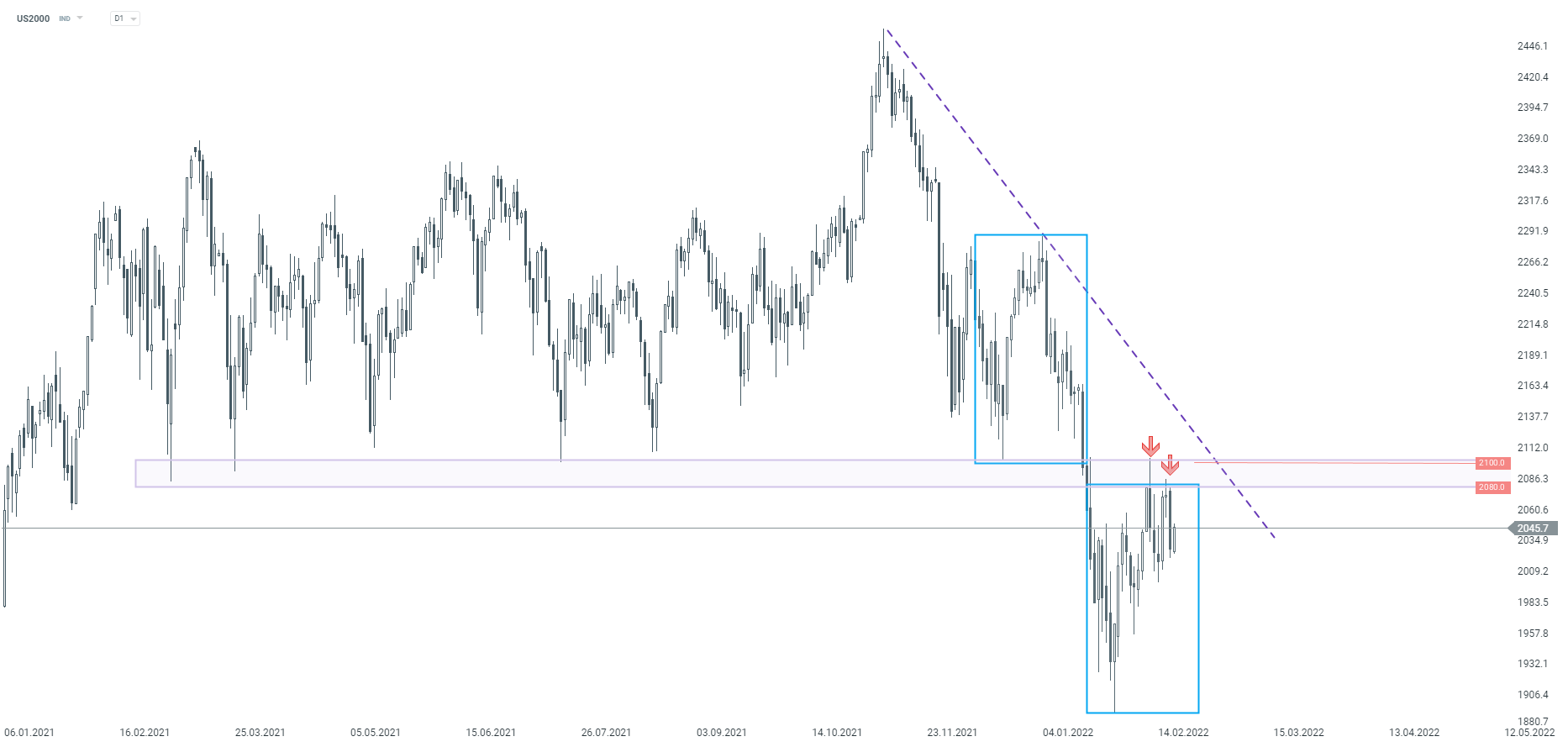 En examinant le graphique US2000 à l'intervalle D1, nous pouvons constater que l'indice a atteint la limite supérieure de la géométrie du marché de court terme cette semaine. Cet obstacle technique sert également de limite inférieure à la zone de résistance de 2 080-2 100 pts. D'un point de vue technique, il pourrait s'agir d'un moment décisif pour l'indice. Un dépassement de la zone de résistance susmentionnée pourrait indiquer que la tendance à court terme s'est inversée à la hausse et qu'un mouvement de reprise se profile. D'un autre côté, si nous constatons une faiblesse supplémentaire au cours de la session américaine d'aujourd'hui et que l'indice s'éloigne de la résistance, une nouvelle baisse deviendra le scénario le plus probable.