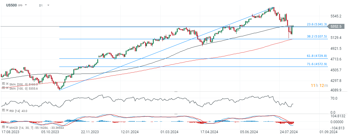 - Le contrat US500 a progressé de près de 2,5 % hier, et l'indice S&P 500 a enregistré un gain de 2,3 %, marquant ainsi une session record depuis 2022. Les investisseurs ont donc ressenti une bouffée d'optimisme, alimentée par des résultats macroéconomiques meilleurs que prévu pour l'économie américaine ; les craintes d'une récession se sont apaisées (même si, comme le montre l'ampleur du rebond après les récentes baisses, ce n'est pas tout à fait le cas).