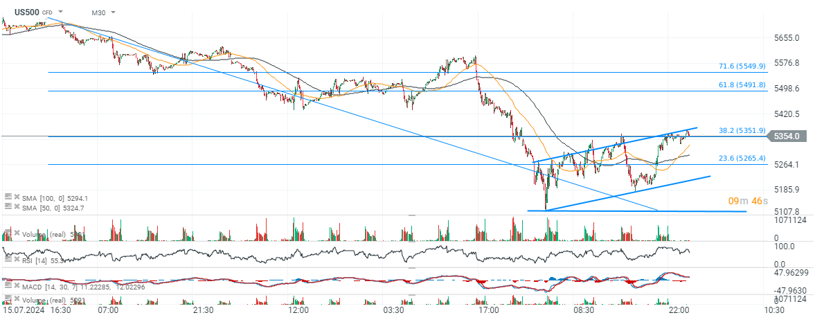 Le contrat S&P 500 (US500) se négocie avec des gains relativement modestes aujourd'hui, après la séance record d'hier depuis 2022. L'indice a dépassé les 5340 points, où l'on voit le retracement de 23,6 Fibonacci de la vague haussière de l'automne 2023 et la SMA100 (ligne noire). La résistance clé se situe autour de 5500 points. Une chute en dessous de la Fibo 23,6, confirmée par un volume élevé, pourrait suggérer une pression pour un nouveau test autour de 5100 points, où nous voyons la SMA200 (ligne rouge) et la Fibo 38,2. La dernière fois que le contrat a été en dessous de la SMA200, c'était à l'automne de l'année dernière.