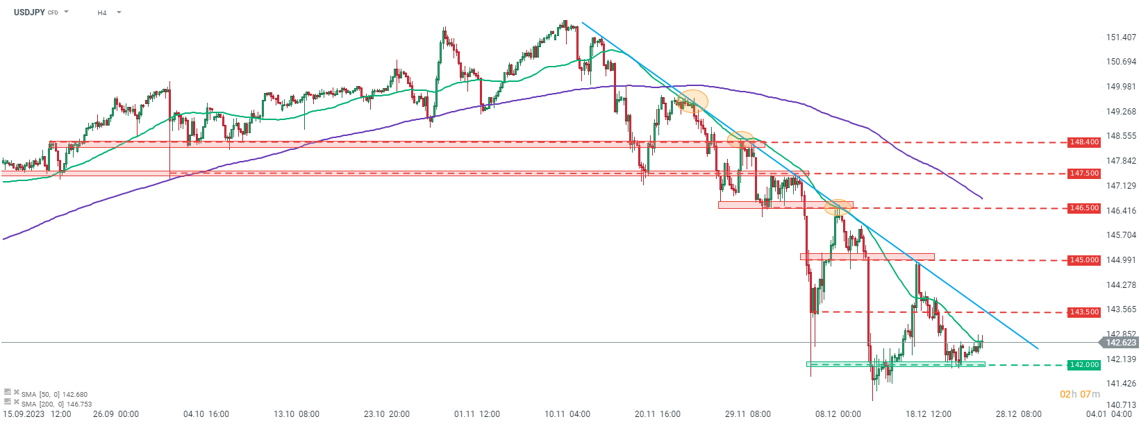 En regardant le graphique de l'USDJPY à l'intervalle H4, nous pouvons voir que la paire a récemment rebondi sur la zone des 142,00 et tente de lancer une nouvelle correction à la hausse dans la tendance baissière actuelle. La paire tente de dépasser la moyenne mobile à 50 périodes (ligne verte) aujourd'hui, qui a stoppé les corrections à plusieurs reprises. Cependant, les haussiers devraient également dépasser la ligne de tendance baissière, actuellement dans la zone des 143,50 afin que la tendance s'inverse.
