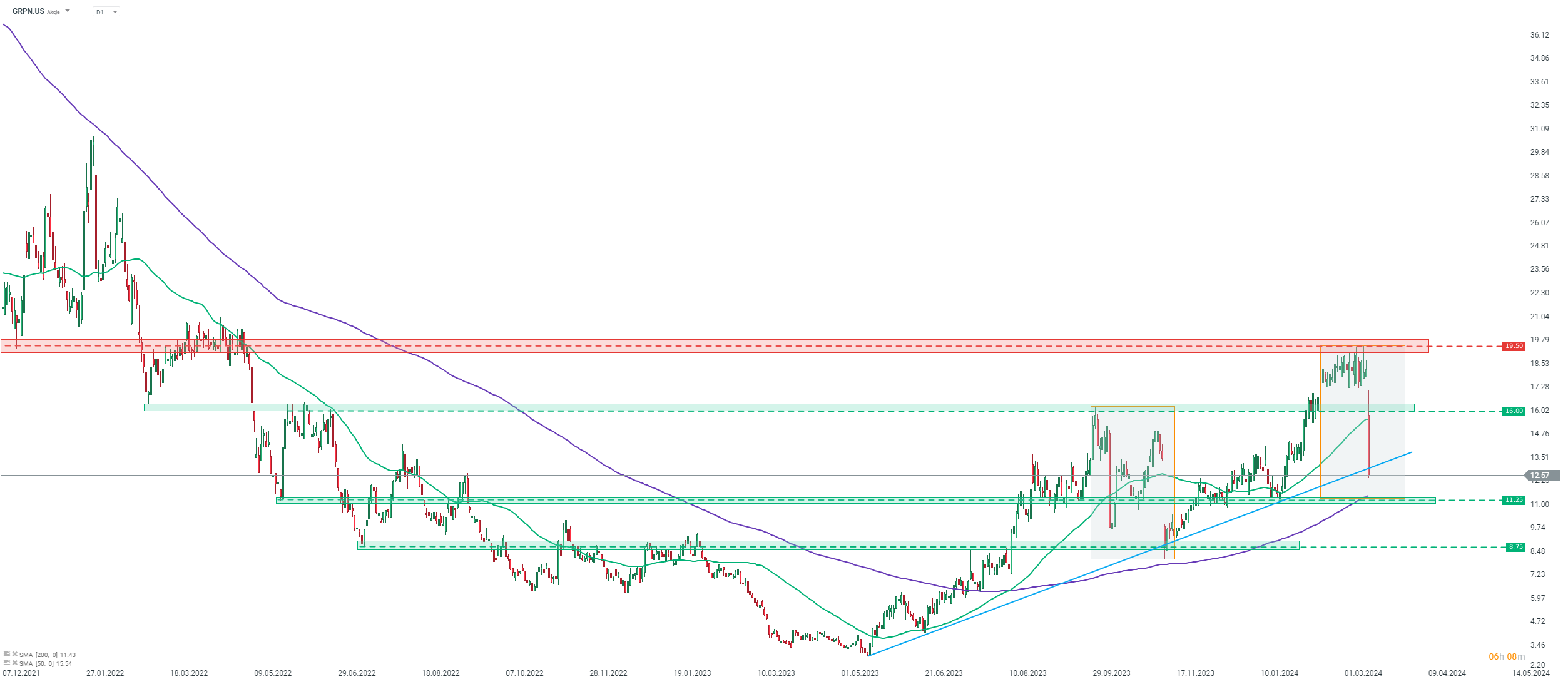 Groupon (GRPN.US) est l'une des actions américaines les moins performantes aujourd'hui avec une chute de près de 30%. Cette chute fait suite à la publication des résultats du quatrième trimestre 2023. Le rapport n'est pas si mauvais, l'entreprise ayant dépassé les attentes sur la plupart des indicateurs. Toutefois, le chiffre d'affaires, la facturation brute et le nombre de clients actifs ont tous diminué par rapport à l'année précédente. Les résultats ont montré que le redressement de l'entreprise s'est accéléré au cours du dernier trimestre 2023 et le recul d'aujourd'hui peut être considéré dans une certaine mesure comme une prise de bénéfices après une hausse d'environ 140 % entre la mi-novembre 2023 et la mi-mars 2024.