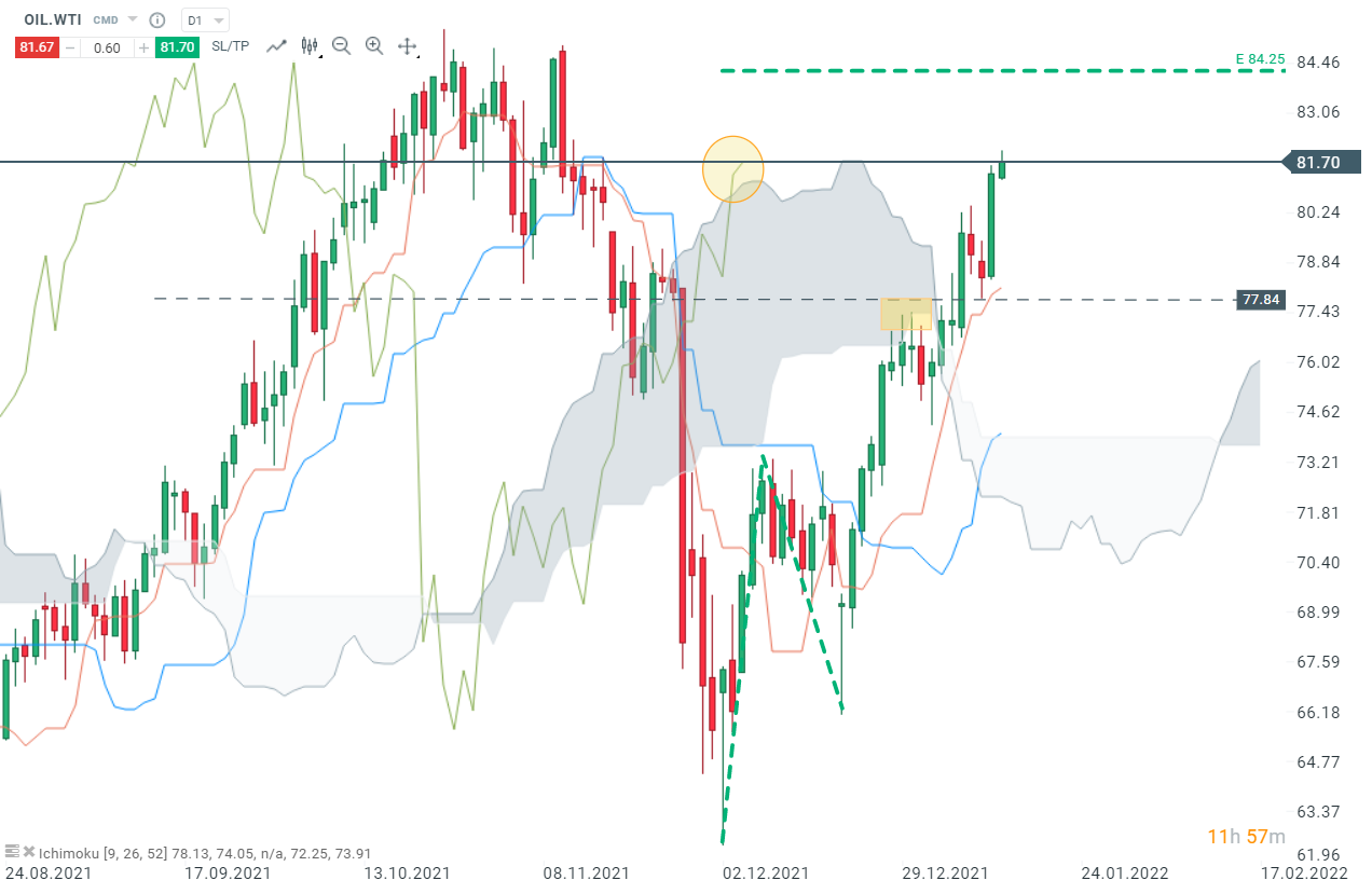 En regardant le graphique journalier avec ichimoku, on peut constater que la hausse s'est arrêtée au bas du nuage (rectangle jaune). Cependant, les prix ont réussi à traverser le nuage par un " twist " (croisement de la Senkou Span A et de la Senkou Span B), ce qui est souvent le cas car le nuage est plus faible à cet endroit.