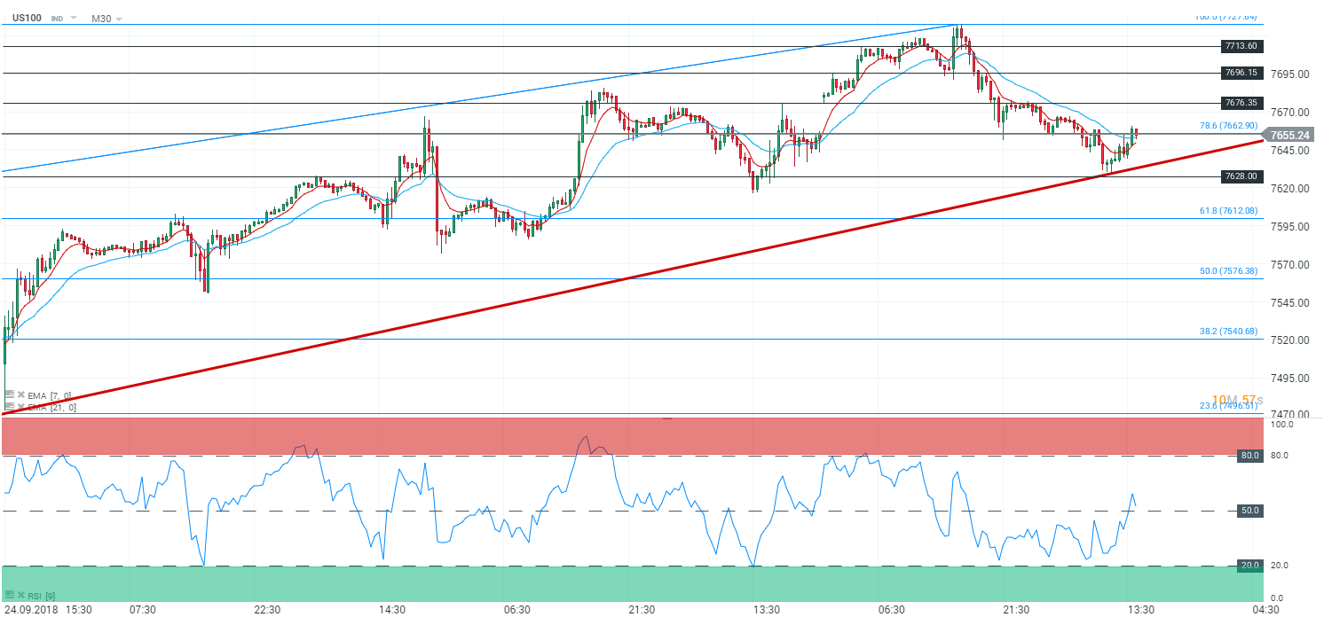 En 15 minutes (M15), le Nasdaq (US100) évolue également en tendance haussière depuis la fin de la matinée. Les cours sont portés par les moyennes à 7 et 21 périodes. Le RSI est orienté à la hausse proche de sa zone de neutralité et oscille à 52 points. Les prix tentent de s’affranchir de la zone de résistance matérialisée par les 78,6 % des retracements de Fibonnaci à 7 662,90 points. Dans ce contexte nous avons un biais haussier sur l’indice avec en ligne de mire le niveau des 7 676,35 points – puis le niveau des 76 96,15 points par extension.