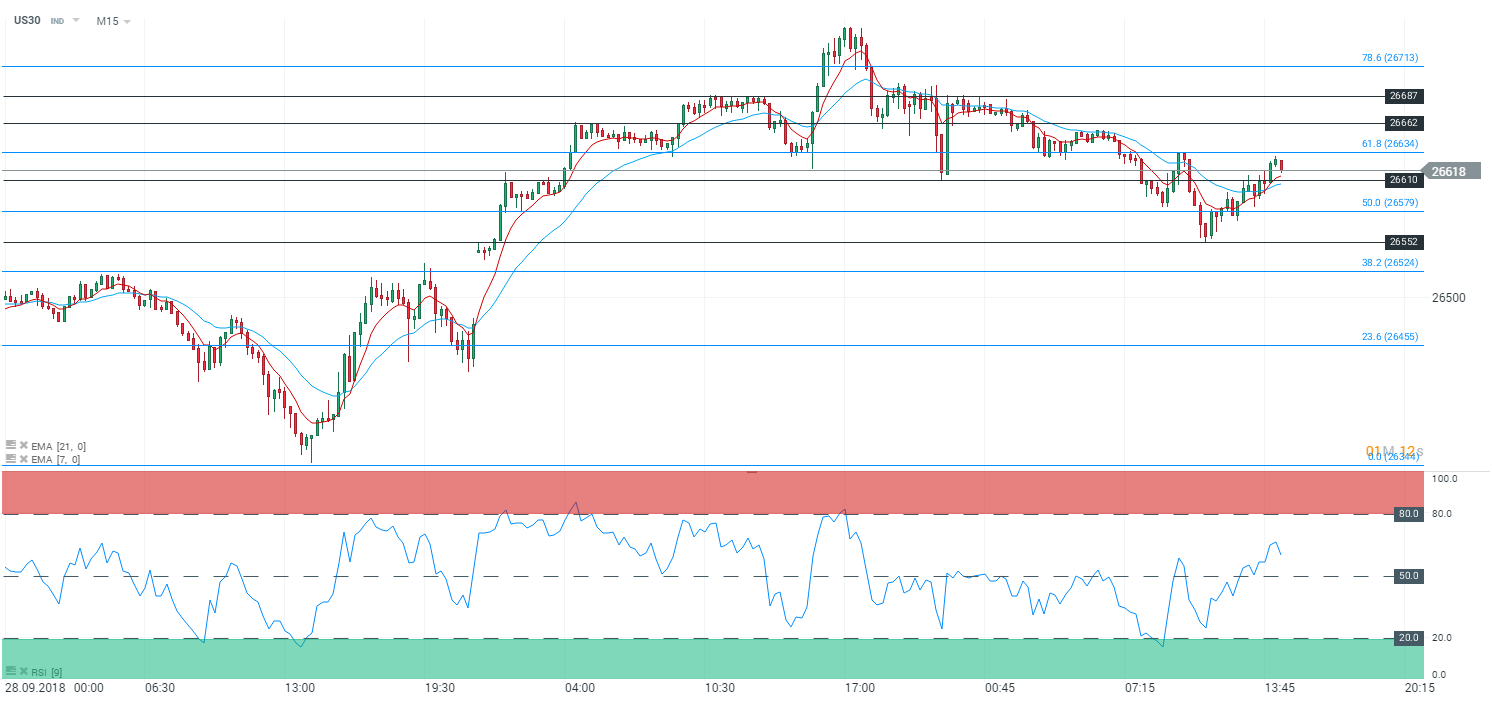 Même son de cloche pour l’indice Dow Jones (US30) qui évolue depuis la fin de matinée en tendance haussière. Les prix sont soutenus par les moyennes mobiles à 7 et 21 périodes. Le RSI est bien orienté à la hausse et tend à s’aplatir à 63,7 points. Les prix se situent à présent proche du niveau des 61,8 % des retracements de Fibonnaci. Dans ce contexte nous avons un biais haussier sur l’indice avec en ligne de mire le niveau des 26 662 points – et par extension le niveau des 26 687 points.