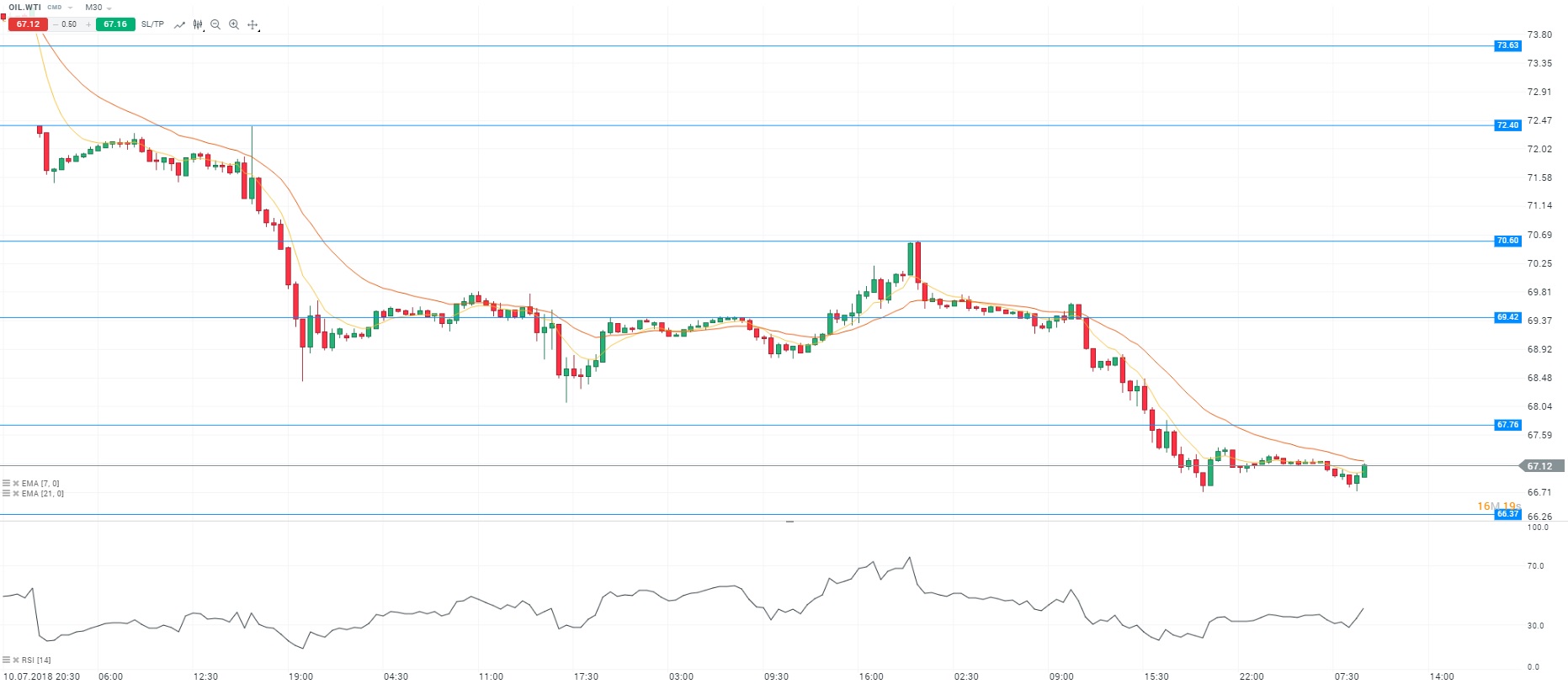 Sur le plan des matières premières, le contrat WTI a terminé lundi en forte baisse de 4,15% au niveau des 68,06 dollars le baril. La tendance baissière s’explique par la réouverture des ports libyens qui facilite ainsi l’acheminement du pétrole. Par ailleurs, le contexte reste marqué par les mouvements sociaux en Norvège et en Irak. Enfin, le ministre russe de l’Energie, Alexandre Novak, a indiqué que la Russie et d’autres pays producteurs pourraient augmenter leur production en cas de pénurie sur le marché. D’un point de vue technique, les prix évoluent autour des moyennes mobiles (à 7 et 21 périodes) en unité de temps M30. Le RSI est stable proche de sa zone de survente. En conclusion, nous avons un biais vendeur avec comme objectif le niveau des 66,37 dollars le baril.