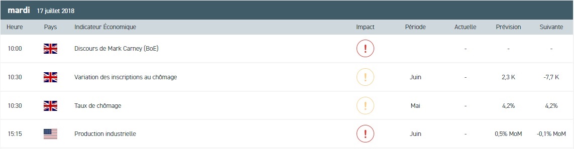 La séance du jour sera marquée par l’audition de Jerome Powell, président de la Réserve fédérale (Fed), devant le Sénat américain. Le rythme de relèvement des taux d’intérêt et l’impact des tensions commerciales sur la politique monétaire de l’institution sera à l’ordre du jour. Sur les marchés, Wall Street a clôturé en ordre dispersé en raison de la chute des cours du pétrole malgré les bons résultats trimestriels de Bank of America. Du côté des valeurs, Netflix a pénalisé le secteur technologique suite à la publication de mauvais résultats trimestriels. La publication des résultats de Johnson & Johnson, Unitedhealth et Goldman Sachs est prévue ce jour. En Europe, les indices ont terminé dans le rouge lundi, mis à part le DAX 30. L’indice allemand a bénéficié des bonnes prévisions de résultats de Deutsche Bank pour le second trimestre. Les valeurs énergétiques ont reculé dans le sillage des cours du pétrole. Du côté de l’Asie, le Nikkei 225 a fini en hausse de 0,44% au niveau des 22 697 points, soutenu par l’affaiblissement du yen.