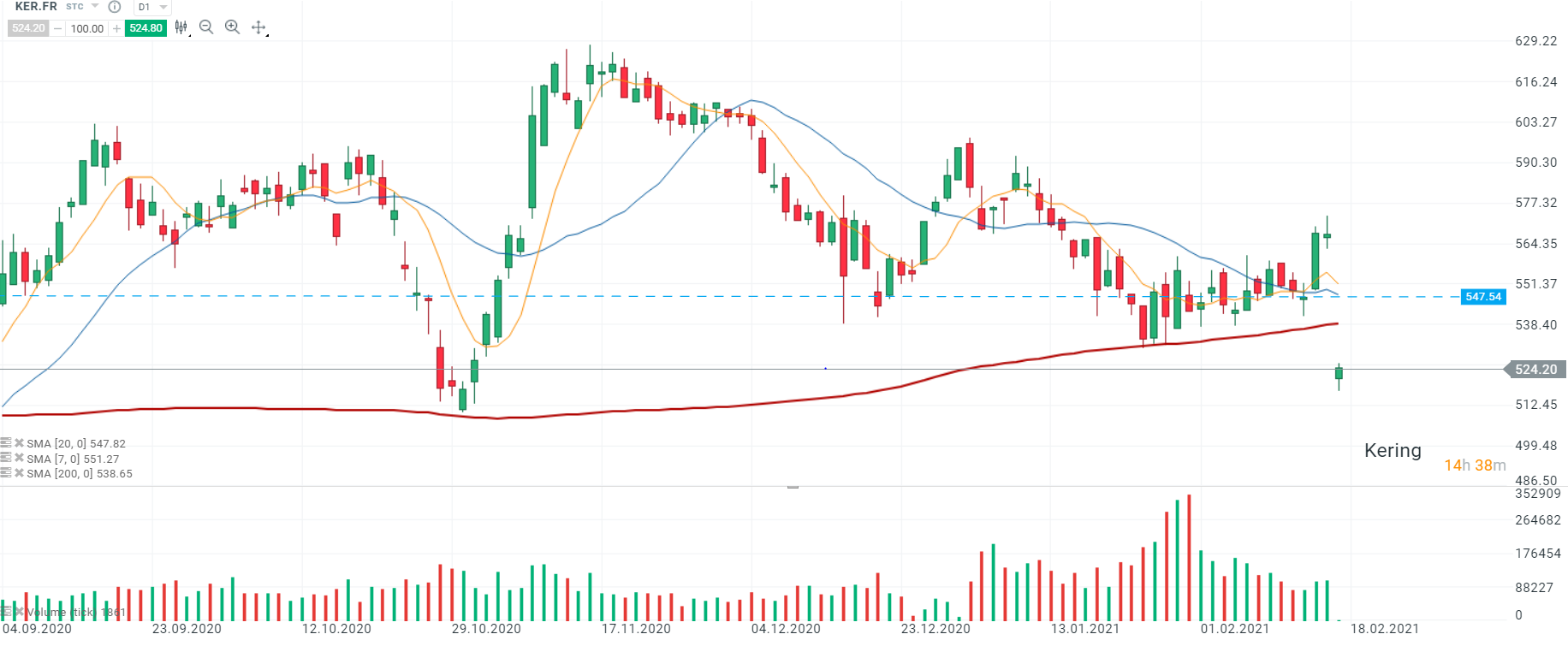 Les cours de Kering (KER.FR) ont ouvert avec un gap baissier massif, se dirigeant vers la SMA 200 (ligne rouge) au moment de la rédaction de ces lignes. En cas de franchissement de ce niveau, le mouvement haussier pourrait s’accélérer vers la SMA 20 (ligne bleue) au niveau des 547,54 en vue de combler le gap baissier à plus de 50%. Source : xStation5
