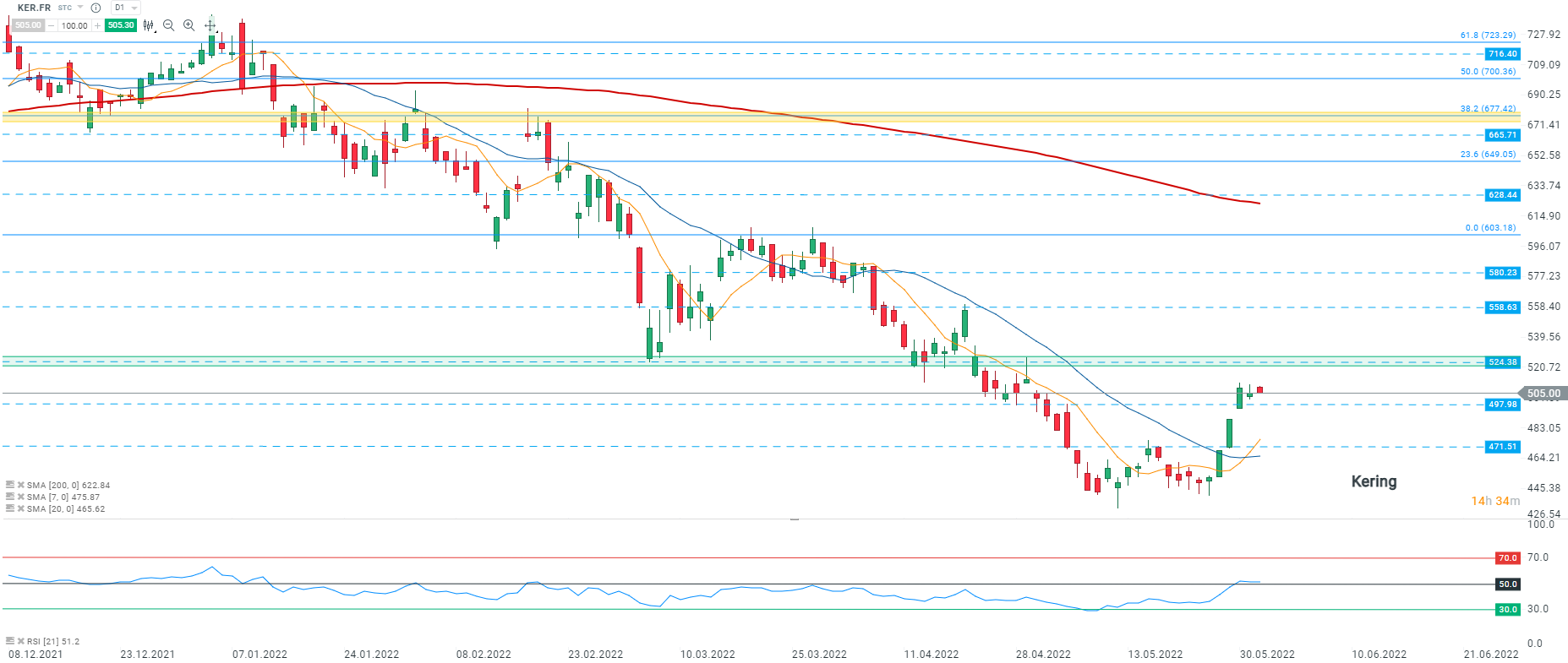 Les cours de Kering (KER.FR) ont ouvert à la hausse lors de la séance d’aujourd’hui mais se replient au moment de la rédaction de ces lignes. Toutefois, on remarque d’un point de vue technique que le RSI évolue au-dessus de la zone de neutralité de 50 signifiant que les acheteurs ont toujours l’avantage et que les perspectives sur le titre restent haussières. Dans un tel contexte, la résistance à 524,38 constitue la prochaine cible pour les acheteurs. Source : xStation5