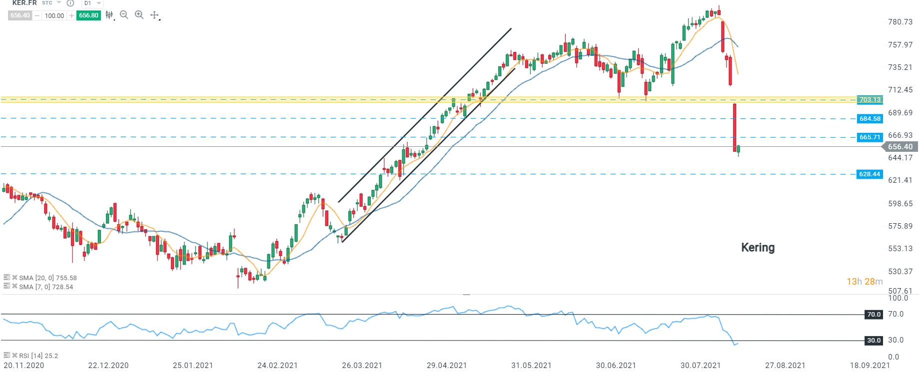 Après avoir perdu plus de 18% depuis le sommet du 13/08, les cours de Kering (KER.FR) semblent bénéficier d’une légère impulsion haussière, se dirigeant vers la précédente zone de support à 665,71. De plus, on observe d’un point de vue technique, que le RSI est inférieur à 30 signifiant que le marché est candidat à une correction à la hausse. Toutefois, si les vendeurs gardent le contrôle, la baisse pourrait s’étendre en direction de la précédente zone de support à 628,44. Source : xStation5