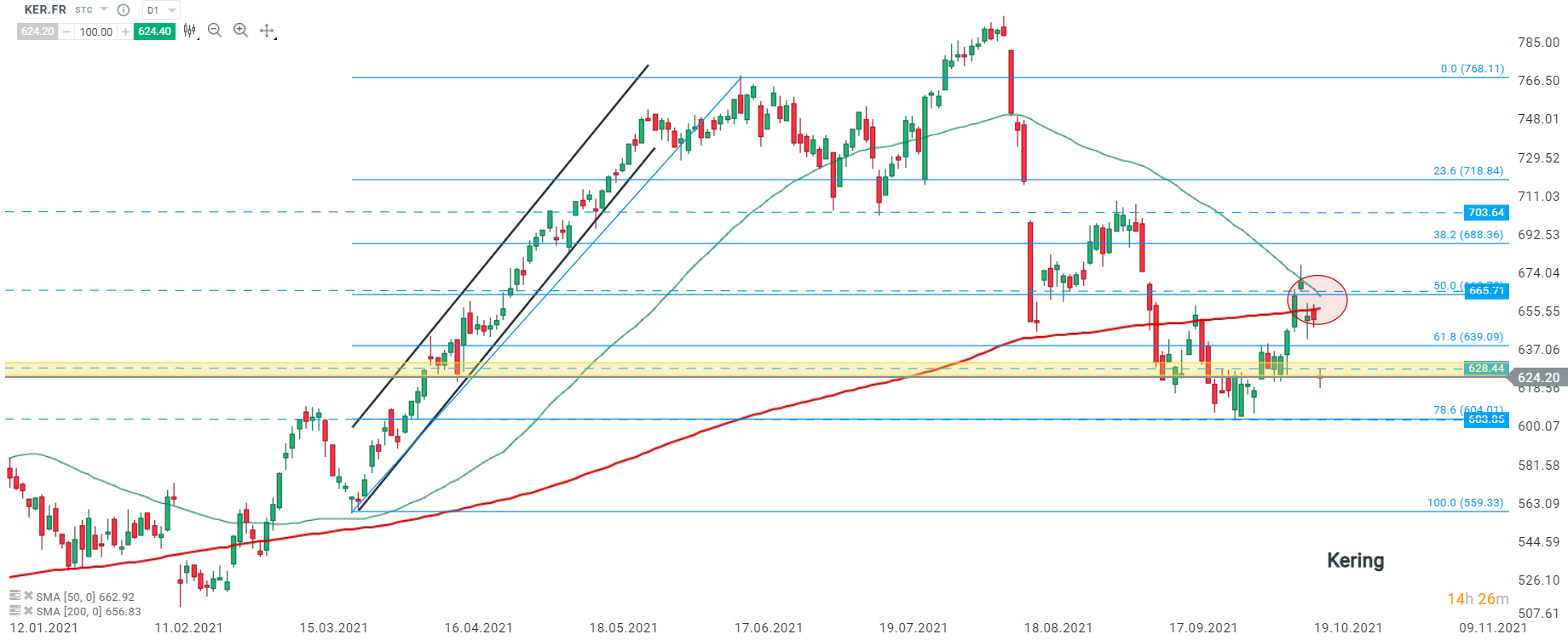 Les cours de Kering (KER.FR) ont ouvert avec un important gap baissier, souffrant de la comparaison avec les résultats de LVMH. Au moment de la rédaction de ces lignes, les cours se dirigent vers la résistance à 603,05 où coïncide le retracement à 78,6% de la hausse entamée le 25/03/21 . On remarque d’un point de vue technique que la SMA 50 (ligne verte) s’apprête à croiser à la baisse la SMA 200 (ligne rouge) et former potentiellement un death cross, signal baissier. Toutefois, si les acheteurs prennent le contrôle, la résistance à 628,44 constitue la prochaine cible. Source : xStation5