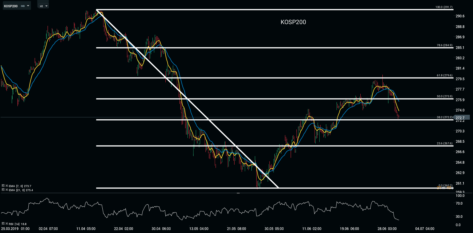 L’indice séoulite a réagi négativement aux mauvaises données macroéconomiques. Après avoir touché un plus haut datant du 10 mai 2019, les 279,6 points (61,8 % des retracements de Fibonacci), le KOSP200 s’est affranchi à la baisse de plusieurs zones de supports. Pour l’heure, les haussiers s’appuient sur le seuil des 272 points pour prendre un second souffle. L’issue des tensions commerciales et la santé économique de l’Empire du milieu auront une grande influence sur les marchés actions sud-coréens.