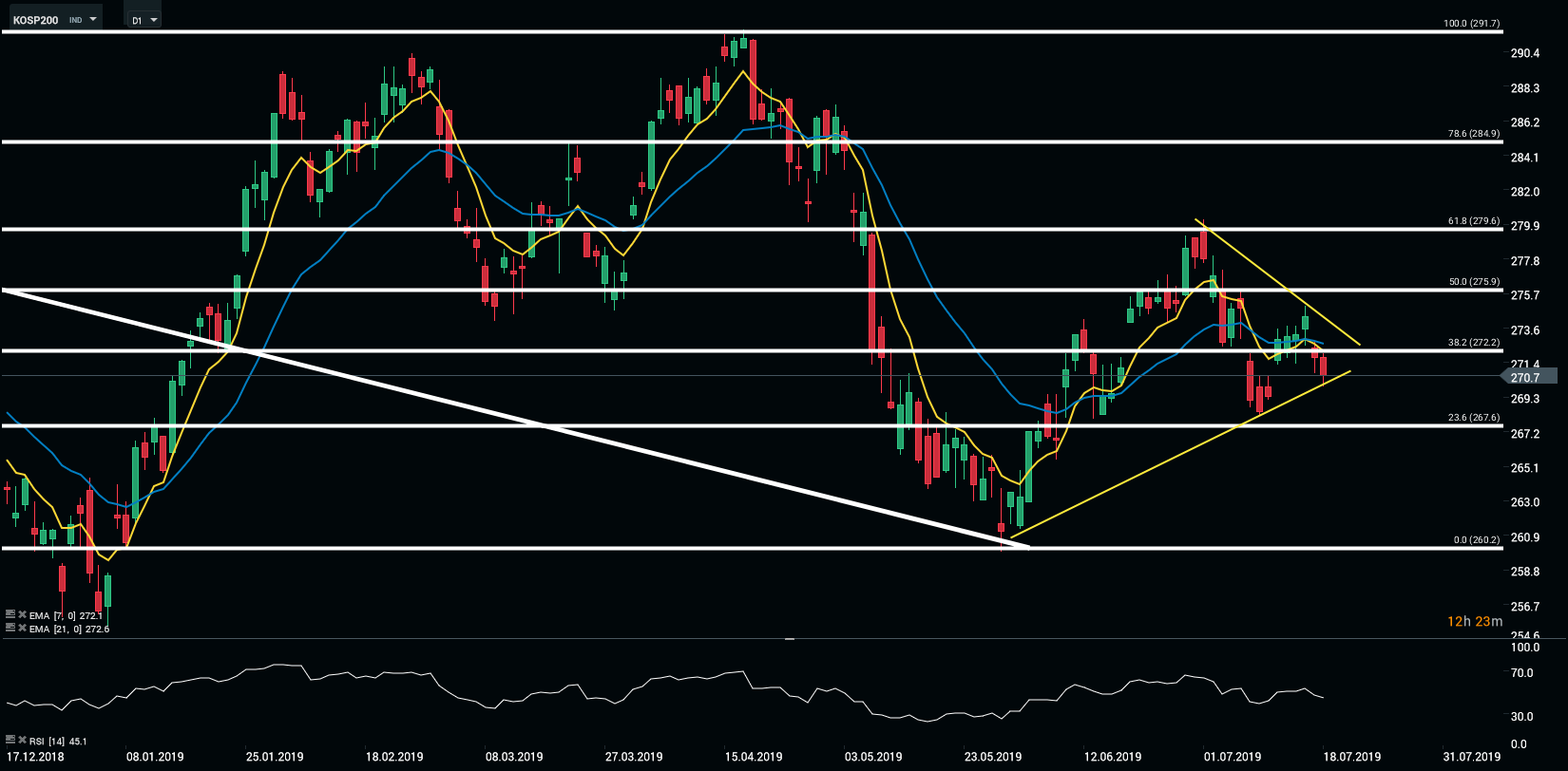 Nous constatons que malgré l’initiative de la Banque de Corée, les investisseurs continuent d’être pessimistes. Le KOSP200 évolue depuis mai 2019 dans un triangle ascendant. Toutefois, l’assouplissement monétaire initié par Séoul aurait dû permettre aux haussiers de franchir le seuil psychologique des 38,2 % des retracements de Fibonacci. Que nenni. Les baissiers ont profité de la baisse des prévisions de croissance de la Banque pour rallier la borne inférieure du triangle (270 points). La Fed aura une influence sur l’évolution de l’indice sud-coréen.