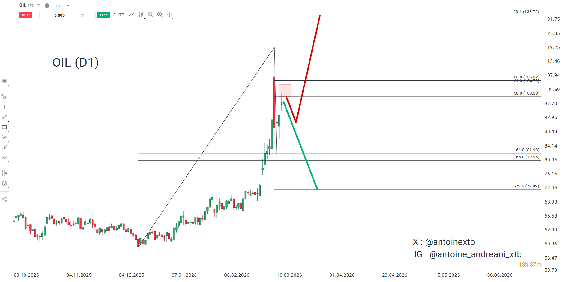 Si le WTI dépasse 104,6 dollars le baril (parcours rouge ci-dessous), les tensions sur les marchés pourraient grandement s’intensifier. À l’inverse, une cassure nette du seuil des 76,8 dollars (parcours vert) soulagerait les actifs risqués et les métaux précieux, ouvrant la voie à de nouveaux sommets historiques.