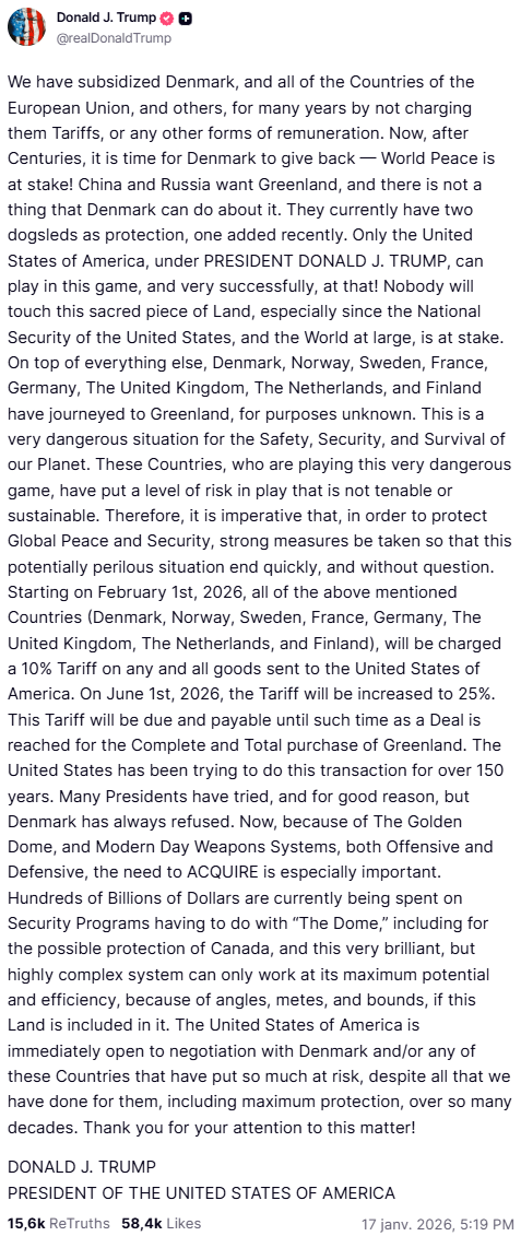 Le message publié ce week-end sur Truth Social ne constitue donc pas une surprise, ni par son contenu ni par son calendrier. Les annonces de ce type interviennent fréquemment lorsque Wall Street est fermée, limitant toute réaction immédiate des marchés américains.