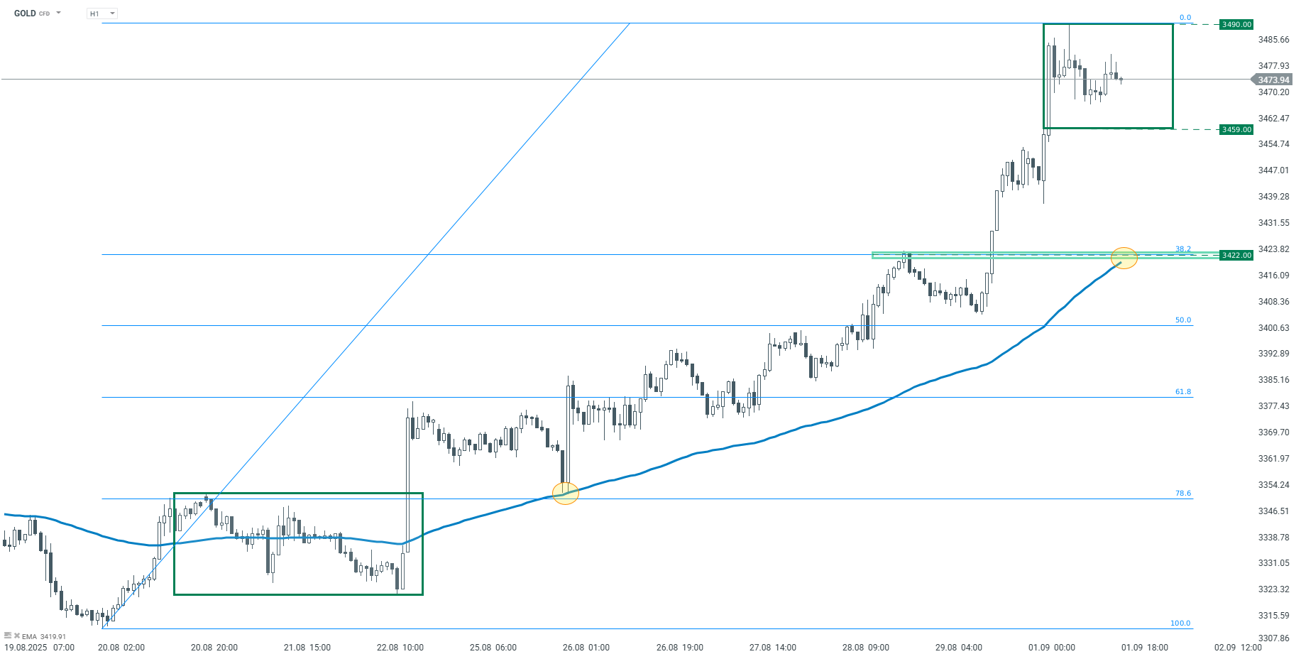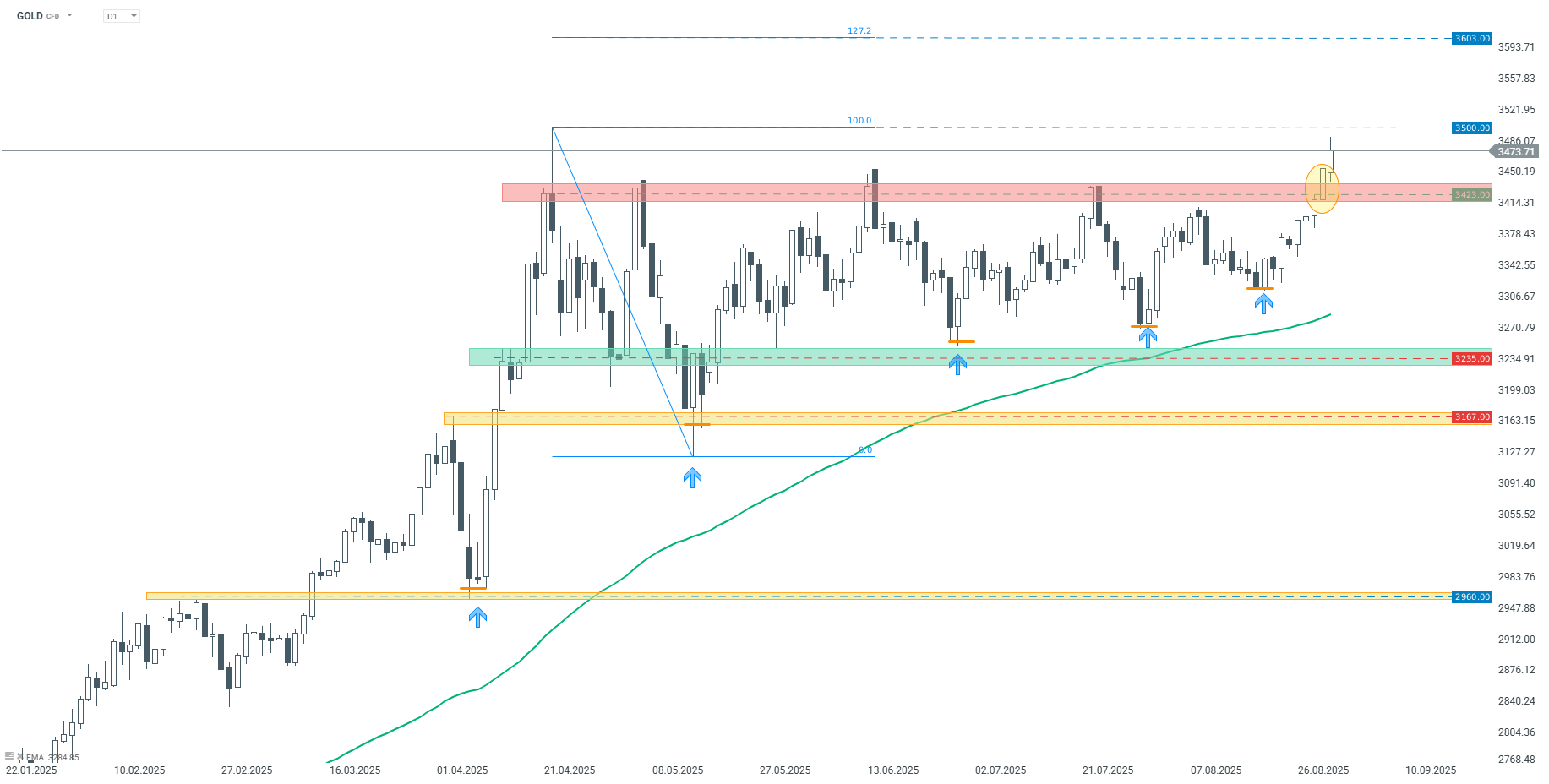 En observant le graphique de l'or (GOLD) sur l'intervalle D1, le prix a dépassé le niveau de résistance clé de 3423 $ la semaine dernière. La zone marquée en rouge résulte de la limite supérieure de la consolidation et, selon les hypothèses classiques de l'analyse technique, un dépassement de cette limite ouvre l'ouverture à une nouvelle impulsion haussière. La condition est que le prix reste au-dessus de la zone susmentionnée à 3 423 $, qui devrait désormais servir de support. Si ce scénario se confirme, la résistance la plus proche sera le retracement de Fibonacci à 127,2 %, déterminé à partir de la dernière correction.