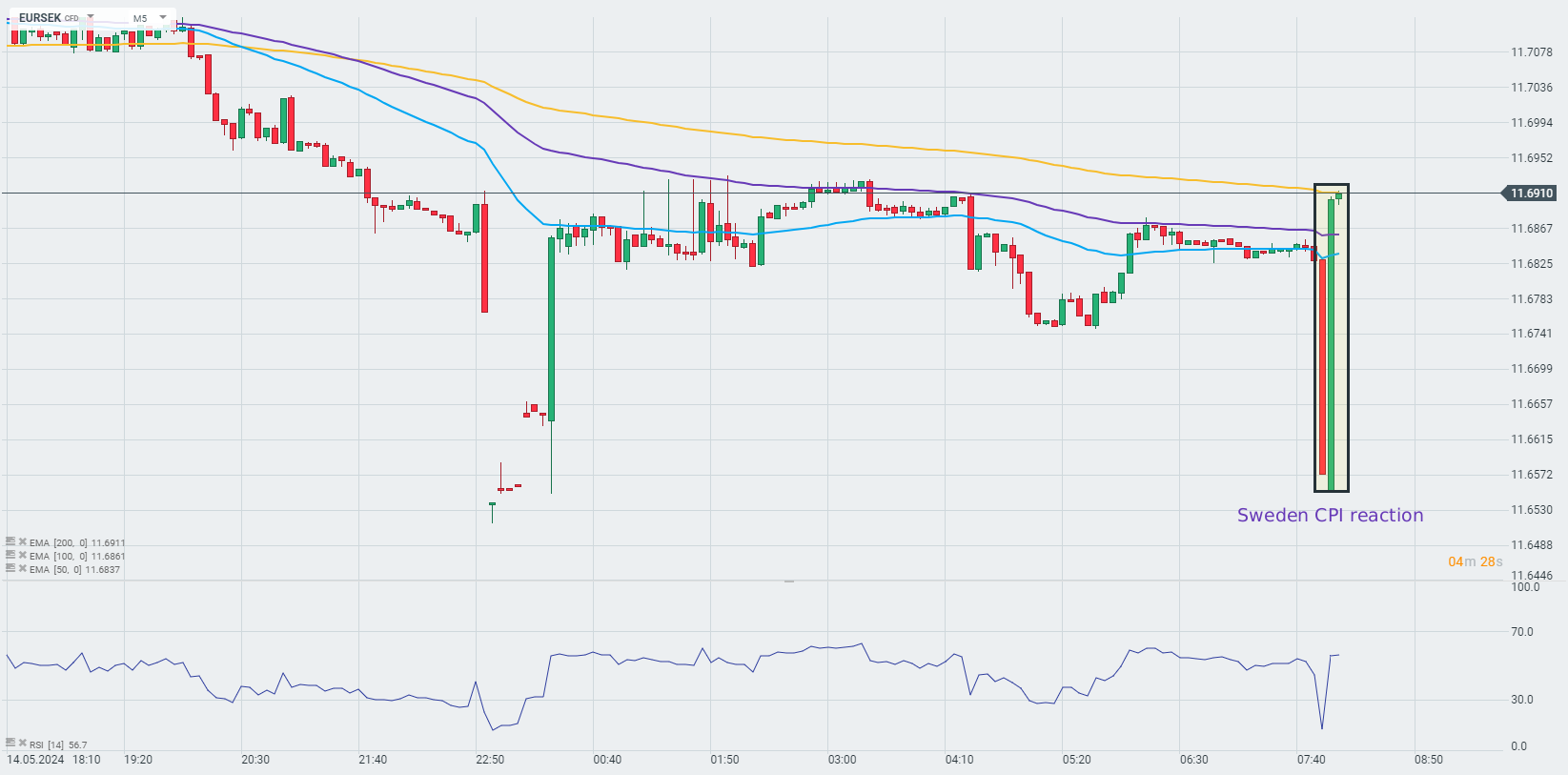 La SEK perd du terrain par rapport à l'euro après une lecture de l'inflation CPI plus faible que prévu. Des pressions inflationnistes plus faibles pourraient encourager Riskbank à poursuivre une politique monétaire plus dovish à moyen terme, c'est pourquoi nous observons une pression à la baisse sur la SEK.