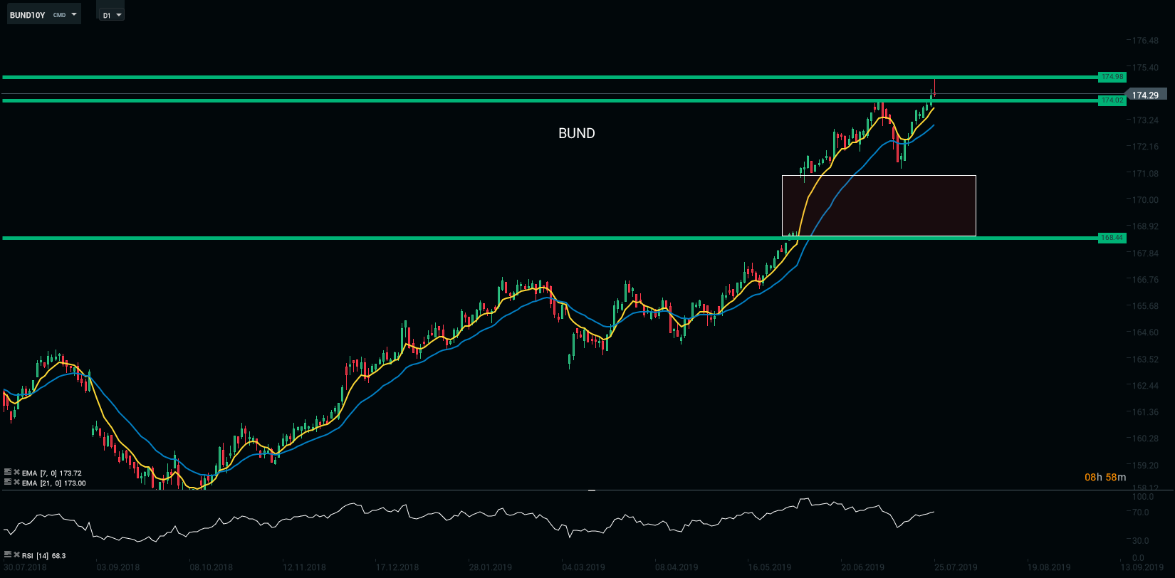 Sur le plan technique, le Bund a grimpé en direction des 174,98. Ces dernières minutes, nous assistons à un retracement baissier. Les vendeurs essayent de rallier les 174,02. Au vu des niveaux actuels, nul doute que les investisseurs peaufinent leur stratégie en attendant le PIB américain du deuxième trimestre (vendredi, 14h30).