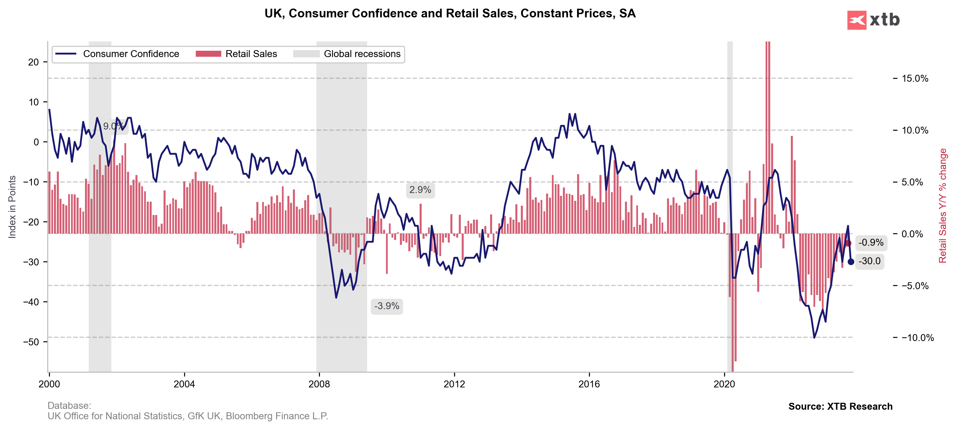 En termes réels, les ventes au détail restent faibles et les variations mensuelles en glissement annuel indiquent un déclin depuis plusieurs mois. L'affaiblissement du marché semble également confirmer la confiance des consommateurs, qui se situe actuellement à des niveaux indiquant historiquement une récession.