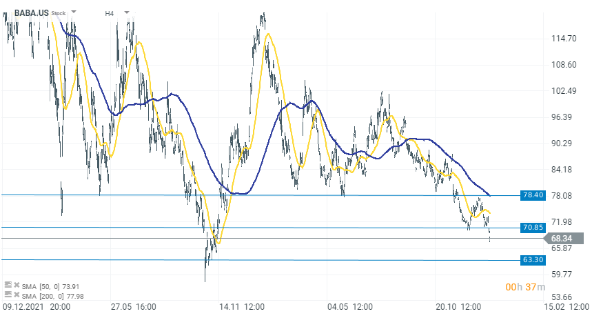 Les actions d'Alibaba (BABA.US) perdent plus de 1,50 % aujourd'hui et sont dans une situation similaire. Le cours actuel se rapproche du creux local de 2022, autour de 60-63 dollars par action.