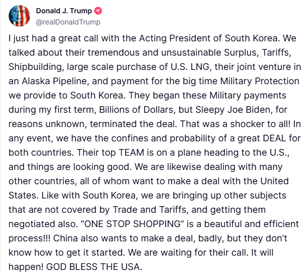 Le président américain Donald Trump a annoncé avoir eu une conversation téléphonique avec le président par intérim de la Corée du Sud, Han Duck-soo. Les discussions ont porté sur plusieurs sujets, notamment l'excédent commercial "énorme et insoutenable" de la Corée du Sud, les tarifs douaniers, la construction navale, l'achat à grande échelle de gaz naturel liquéfié (GNL) américain, un projet de pipeline en Alaska en coentreprise, et les paiements pour la protection militaire américaine fournie à la Corée du Sud. Trump a exprimé son optimisme quant à la conclusion d'un accord bénéfique pour les deux pays, indiquant que l'équipe de négociation sud-coréenne était en route pour les États-Unis.