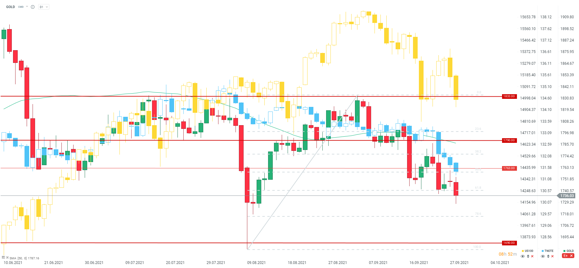 La hausse des rendements obligataires (baisse du prix des TNOTE - graphique bleu) est une mauvaise nouvelle pour l'or, mais aussi pour les entreprises technologiques. L'or s'échange à son plus bas niveau depuis début août, tandis que le Nasdaq (US100) est passé sous la barre des 15 000 points. Source : xStation5