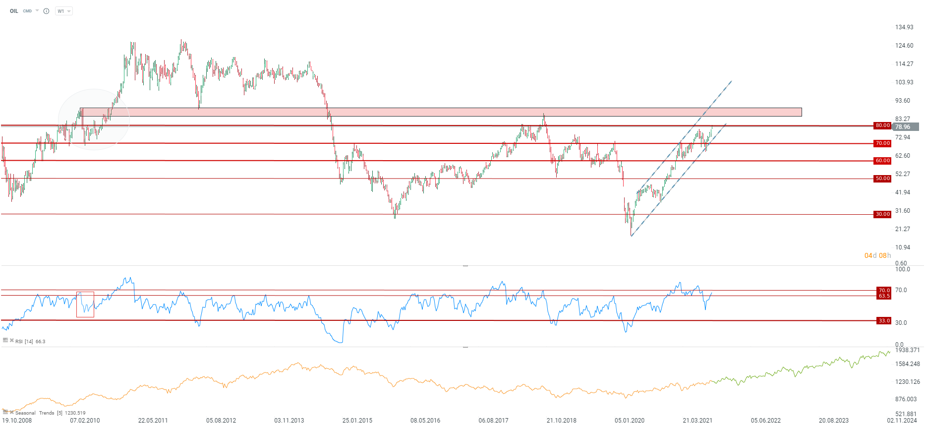 La crise énergétique pourrait faire grimper encore plus les prix du pétrole. La situation actuelle commence à ressembler à 2010 et à la deuxième vague de croissance du marché pétrolier après la crise financière. Toutefois, beaucoup de choses peuvent dépendre de la météo. Un hiver rigoureux signifie également une augmentation de la demande de fioul domestique. La zone de forte résistance la plus proche est située autour de 87-89 $ le baril. Le support est situé à 70 $ et coïncide avec la limite inférieure du canal ascendant. Source : xStation5
