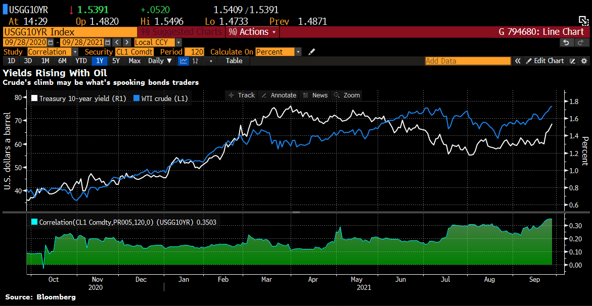 La corrélation entre le prix du pétrole et les rendements obligataires a atteint un pic depuis octobre 2020. Les prix élevés du pétrole reflètent les attentes d'une forte inflation, la perspective d'une hausse des taux et une réduction de l'attractivité des obligations d'État. Source : Bloomberg