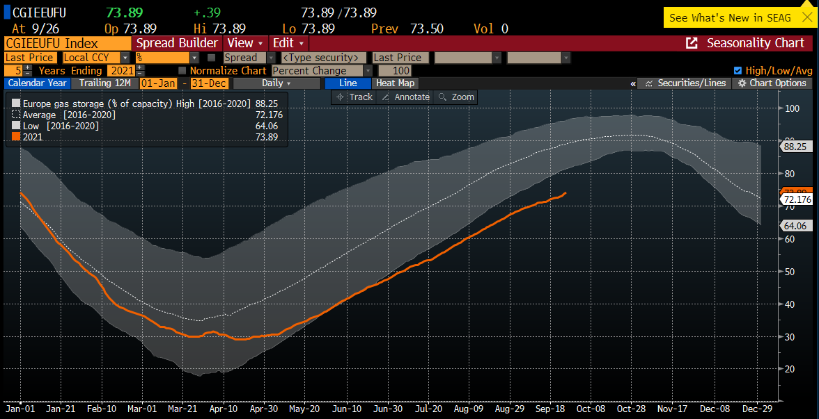 L'utilisation des stocks de gaz en Europe n'est actuellement que de 74 %, la moyenne sur cinq ans étant de 89 %. Selon l'EIA, si l'hiver prochain est rude, certaines régions pourraient être confrontées à des pénuries de produits de base. C'est actuellement le cas en Grande-Bretagne, où les stocks sont épuisés et où la demande continue d'augmenter. Source : Bloomberg