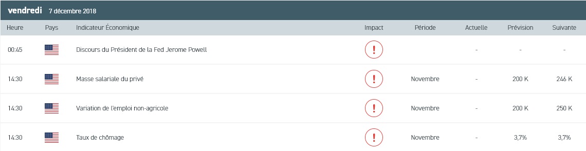 - Le rapport des NFP sur les créations d’emplois au mois de novembre aux Etats-Unis à 14h30