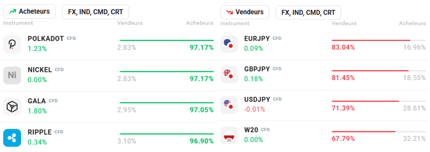 "Ce contenu est une communication marketing au sens de l'art. 24, paragraphe 3, de la directive 2014/65 /UE du Parlement européen et du Conseil du 15 mai 2014 concernant les marchés d'instruments financiers et modifiant la directive 2002/92 /CE et la directive 2011/61 /UE (MiFID II). La communication marketing n'est pas une recommandation d'investissement ou une information recommandant ou suggérant une stratégie d'investissement au sens du règlement (UE) n°596/2014 du Parlement européen et du Conseil du 16 avril 2014 sur les abus de marché (règlement sur les abus de marché) et abrogeant la directive 2003/6 / CE du Parlement européen et du Conseil et directives 2003/124 / CE, 2003/125 / CE et 2004/72 / CE de la Commission et règlement délégué (UE) 2016/958 de la Commission du 9 mars 2016 complétant le règlement (UE) n°596/2014 du Parlement européen et du Conseil en ce qui concerne les normes techniques de réglementation relatives aux modalités techniques de présentation objective de recommandations d'investissement ou d'autres informations recommandant ou suggérant une stratégie d'investissement et pour la divulgation d'intérêts particuliers ou d'indications de conflits d'intérêt ou tout autre conseil, y compris dans le domaine du conseil en investissement, au sens de l'article L321-1 du Code monétaire et financier. L’ensemble des informations, analyses et formations dispensées sont fournies à titre indicatif et ne doivent pas être interprétées comme un conseil, une recommandation, une sollicitation d’investissement ou incitation à acheter ou vendre des produits financiers. XTB ne peut être tenu responsable de l’utilisation qui en est faite et des conséquences qui en résultent, l’investisseur final restant le seul décisionnaire quant à la prise de position sur son compte de trading XTB. Toute utilisation des informations évoquées, et à cet égard toute décision prise relativement à une éventuelle opération d’achat ou de vente de CFD, est sous la responsabilité exclusive de l’investisseur final. Il est strictement interdit de reproduire ou de distribuer tout ou partie de ces informations à des fins commerciales ou privées. Les performances passées ne sont pas nécessairement indicatives des résultats futurs, et toute personne agissant sur la base de ces informations le fait entièrement à ses risques et périls. Les CFD sont des instruments complexes et présentent un risque élevé de perte rapide en capital en raison de l'effet de levier. 71% de comptes d'investisseurs de détail perdent de l'argent lors de la négociation de CFD avec ce fournisseur. Vous devez vous assurer que vous comprenez comment les CFD fonctionnent et que vous pouvez vous permettre de prendre le risque probable de perdre votre argent. Avec le Compte Risque Limité, le risque de pertes est limité au capital investi."
