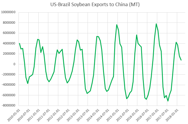 En revanche, la récolte n’a lieu qu’une seule fois par an aux Etats-Unis tandis qu’au Brésil, la récolte de céréales a lieu deux fois par an. Le soja produit au Brésil est donc fortement demandé par la Chine. En outre, comme vous pouvez le voir sur le graphique ci-dessus, la saisonnalité est très forte sur le marché du soja surtout durant le premier semestre de l’année. Sur cette période, la Chine importe beaucoup plus de soja en provenance du Brésil puis s’oriente vers un autre pays le reste de l’année. L’actif étant libellé en dollar américain, il est d’autant plus sensible aux tensions commerciales.