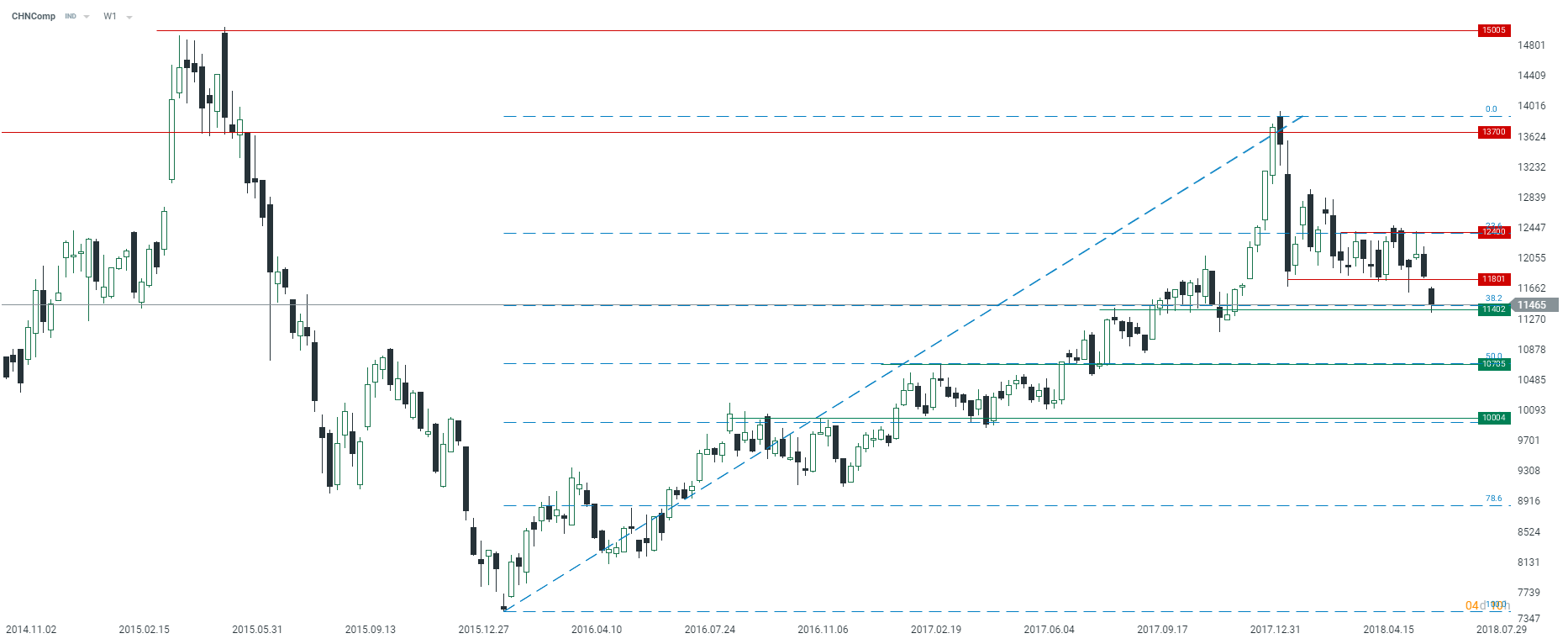 L’indice chinois a franchi un niveau de support/résistance stratégique situé au niveau des 11 800 points correspondant au seuil des 38,2% des retracements de Fibonacci du mouvement haussier amorcé en décembre 2015. Si les cours ne parviennent pas à revenir au-dessus de ce niveau, cela pourrait effacer les gains obtenus sauf en cas d’accalmie entre la Chine et les Etats-Unis. Le niveau des 10 700 points pourrait constituer une forte zone de support dans le voisinage du seuil des 50% des retracements de Fibonacci. Source : xStation5