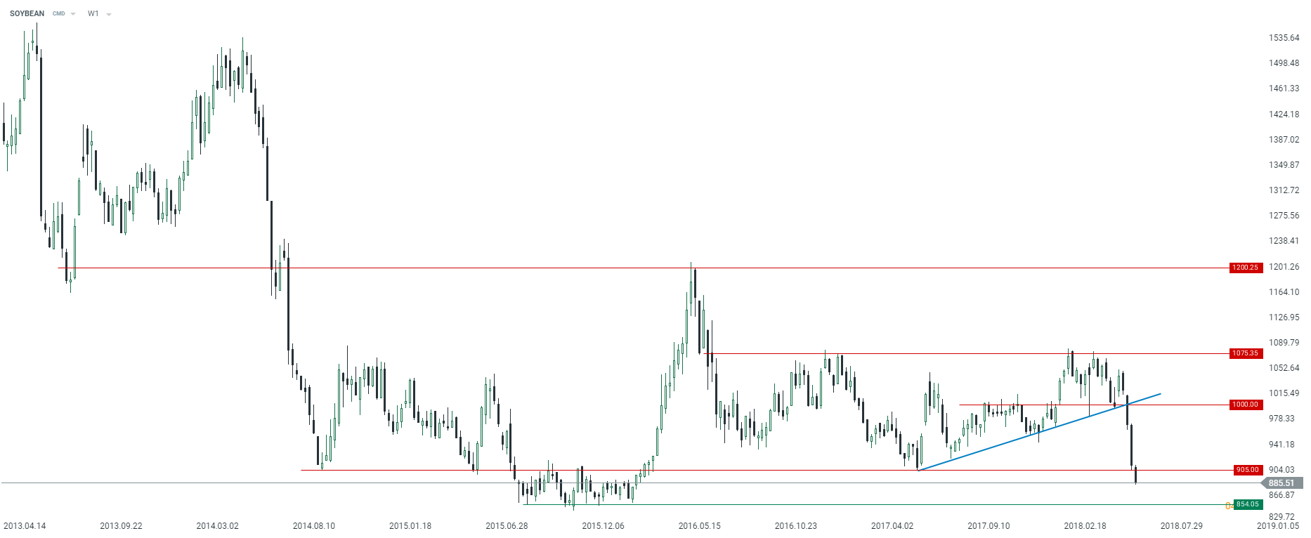Les cours du soja se rapprochent de leurs plus bas niveaux depuis le mois de mars 2009. Le soja pourrait être l’une des matières premières les plus sous-évaluées. Or, les craintes d’une guerre commerciale réduisent actuellement l’attrait pour l’actif. Les résistances majeures se situent aux niveaux des 905 $, 1 000 $ et 1 075 $. Le soja est sur sa plus longue tendance baissière depuis l’année 2014, en unité de temps hebdomadaire (W1).