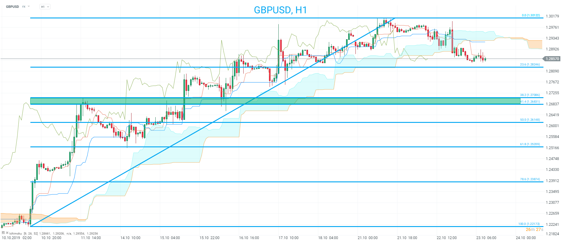 Selon Ichimoku, la paire GBPUSD pourrait baisser à court terme. Les retracements de Fibonacci offrent des niveaux intéressants à regarder au-dessous si les baisses se poursuivaient avec les 23,6% à 1,2825 et les 38,2 % couvrant la zone des1,2683-1,2709. En ce qui concerne la résistance potentielle, le nuage se situe autour de 1,2935 et les plus hauts récents de 1,3012 sont des niveaux à surveiller. Source: xStation
