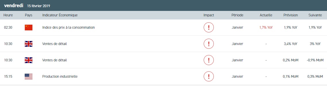 C’est officiel ! Donald Trump va promulguer le projet de loi sur la sécurité aux frontières et décrétera dans le même temps l’état d’urgence afin de débloquer les fonds nécessaires à la construction du mur frontalier avec le Mexique. Par ailleurs, les marchés sont rattrapés par le ralentissement de l’inflation en Chine et la faiblesse des avancées sur la thématique commerciale sino-américaine. Concernant le calendrier économique de ce vendredi, nous prendrons connaissance des ventes au détail du mois de janvier au Royaume-Uni et de la balance commerciale du mois décembre en zone euro. Aux Etats-Unis, on s’intéressera à l’indice d’activité manufacturière dans la région de New York, la production industrielle du mois de janvier, l’indice Reuters-Université du Michigan de confiance du consommateur et l’indice d’activité pétrolière Baker Hughes. En outre, la saison des résultats se poursuivra ce vendredi avec les publications de Pepsico Inc, Allianz SE, Deere & Company et d’Eutelstat.