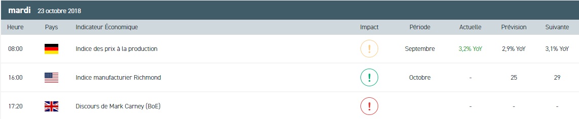 Panique sur les indices européens ! Les marchés ont ouvert en forte baisse dans le sillage des marchés asiatiques. Les indices chinois ont effacé les précédents rebonds techniques en l’espace d’une séance. Dans le même temps, le dollar US évolue sur un plus haut de deux mois. Outre les discours des membres du FOMC (Réserve fédérale – Fed) et de Mark Carney, gouverneur de la Banque d’Angleterre, nous assisterons à l’adjudication obligataire américaine et à la publication des premières estimations de stocks hebdomadaires de pétrole pour la semaine terminée au 19 octobre, selon l’American Petroleum Institute (API). Au chapitre des entreprises, la saison des résultats se poursuivra ce mardi avec les publications de 3M, Caterpillar, Harley-Davidson, Lockheed Martin, Verizon et de Mc Donald’s.