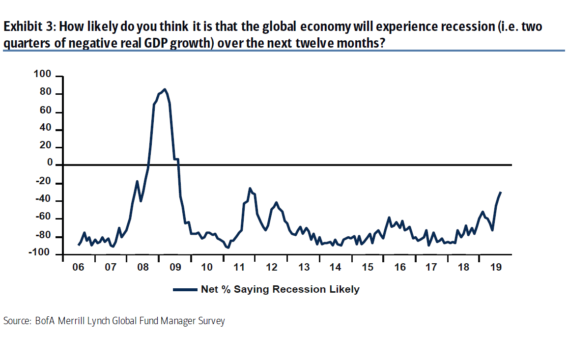 D’après Michelle Meyer, chef économiste pour les Etats-Unis : « Il ressort de notre modèle une probabilité d’environ 20 % de récession au cours des 12 prochains mois, mais nous estimons que la probabilité est plus proche de 30 % ». Plusieurs indicateurs économiques semblent « clignoter au jaune » : l’incertitude autour du conflit commercial sino-américain, le ralentissement de l’économie mondiale, la chute des taux d’intérêts etc. L’inversion de la courbe des taux américains entre l’obligation à 10 ans et 3 mois est également un indicateur de récession - mais selon BofA cela n’est pas aussi inquiétant qu’une inversion qui pourrait avoir lieu entre le taux à 10 ans et à 2 ans (respectivement à 1.63 % et 1.58 %).