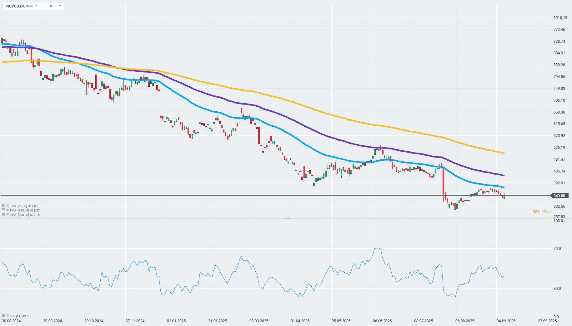 Novo Nordisk (NOVOB.DK) a présenté un plan de restructuration en profondeur. La société prévoit de supprimer jusqu'à 9 000 emplois, soit 11 % de ses effectifs mondiaux, et de se concentrer sur la simplification des structures et l'amélioration de l'efficacité dans ses segments les plus dynamiques : le traitement du diabète et de l'obésité. Le cours de l'action a récupéré ses pertes initiales, progressant de 3,2 %, mais reste bien en deçà des niveaux historiques de l'année. Le cours de l'action a chuté de 67 % par rapport à son plus haut historique, et la société est confrontée à la perte de sa position dominante sur le marché des médicaments contre l'obésité au profit d'Eli Lilly (LLY.US) et à la concurrence des copies de ses traitements phares.